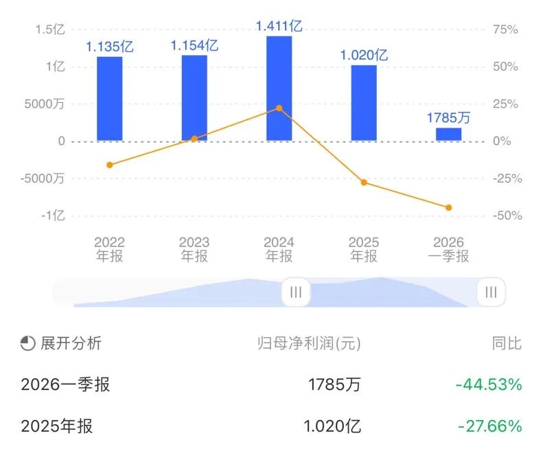 如上图所示,该公司2025年实现归母净利润1.02亿元,同比下滑27.66%;一季度延续下滑态势,实现归母净利润1784.58万元,同比下降44.53%。