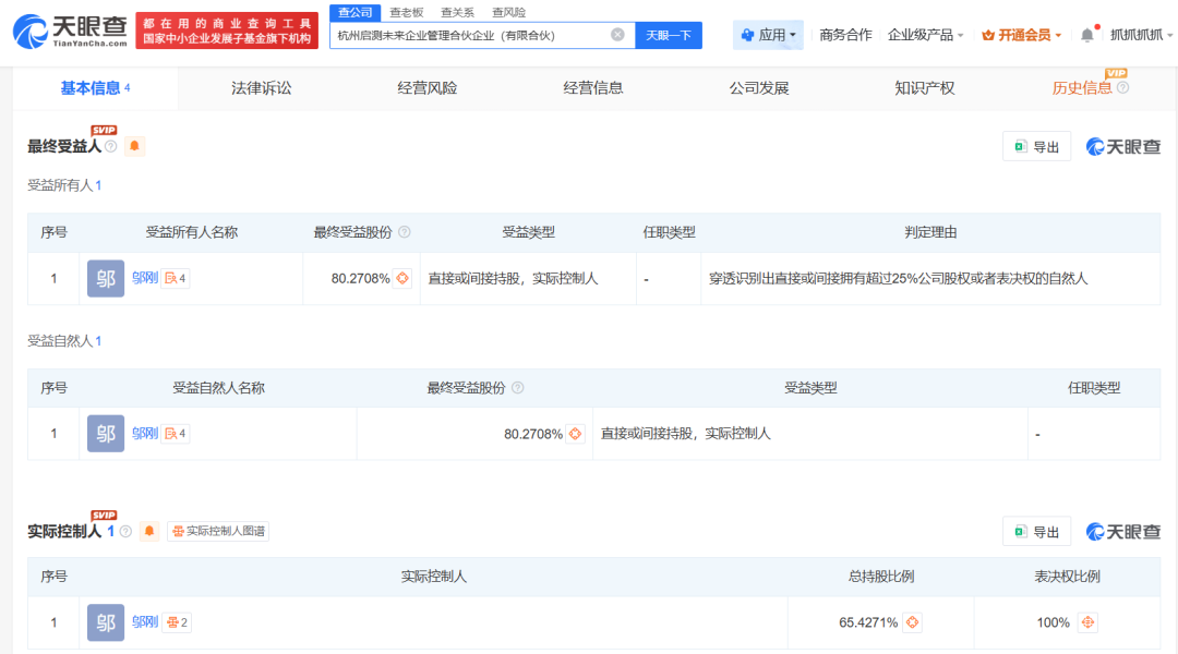 天眼查穿透股权信息显示,启测未来最终受益人及实控人为邬刚,其最终受益股份约80.27%。