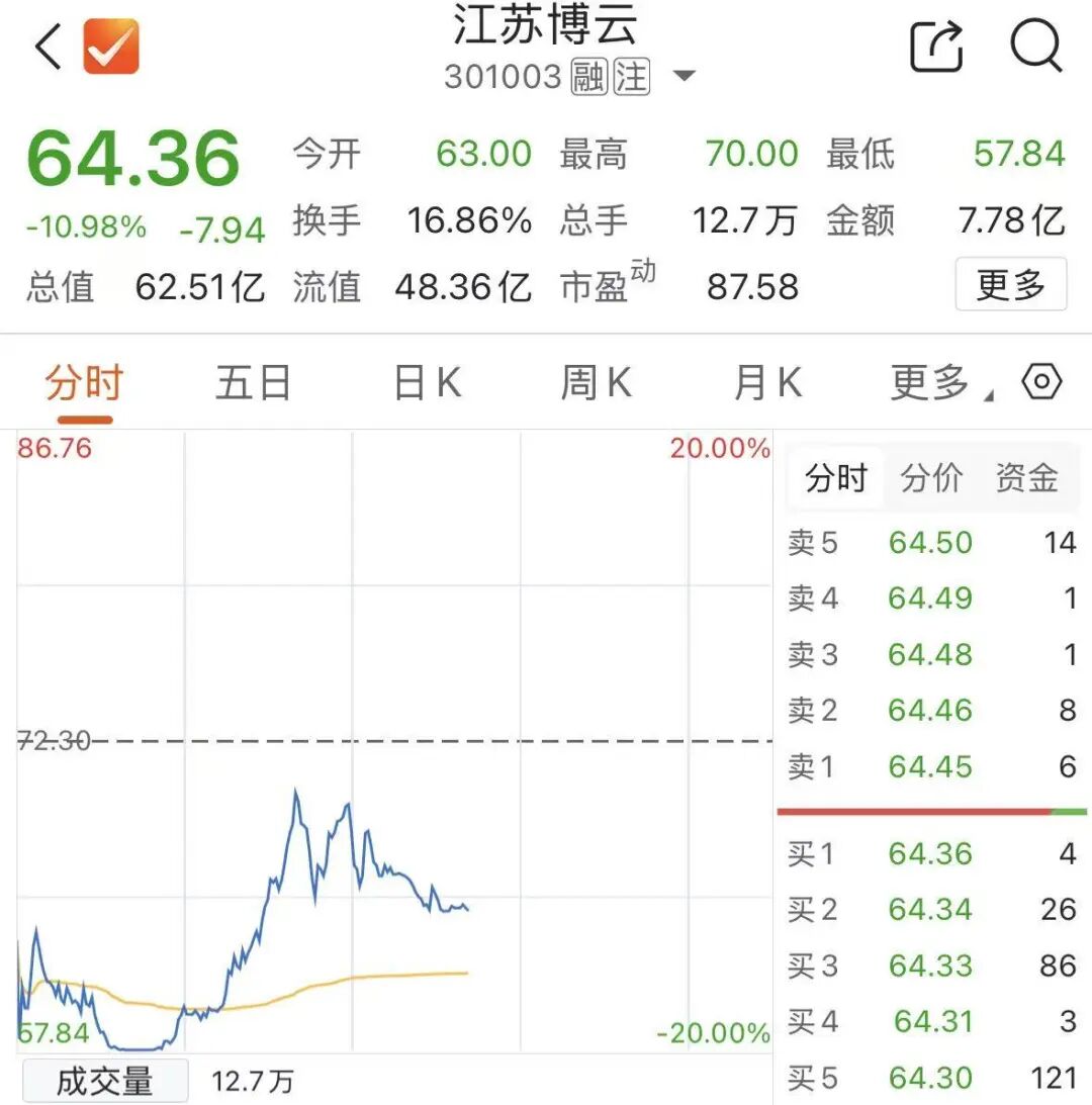 4月27日早盘,江苏博云(301003.SZ)一度“20cm”跌停,截至发稿,跌幅收窄至10.98%。