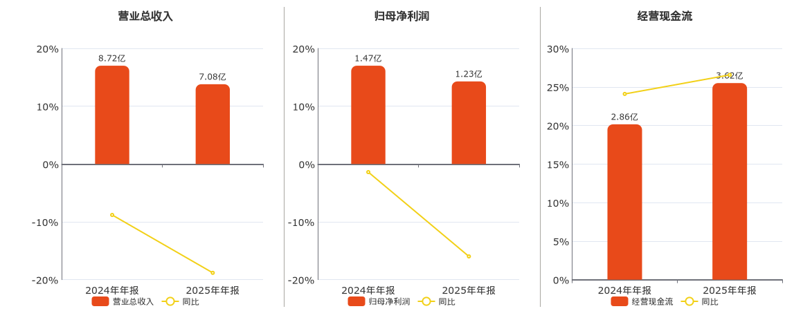 公司营业总收入为7.08亿元,在已披露的同业公司中排名第66,较去年同报告期营业总收入减少1.64亿元,同比较去年同期下降18.82%。归母净利润为1.23亿元,在已披露的同业公司中排名第54,较去年同报告期归母净利润减少2341.66万元,同比较去年同期下降15.98%。经营活动现金净流入为3.62亿元,在已披露的同业公司中排名第55。