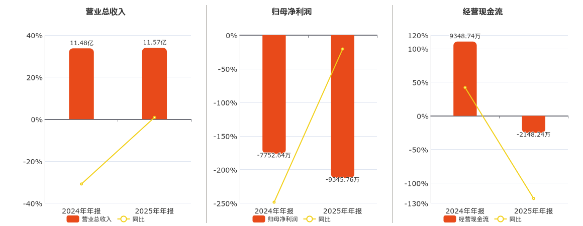 公司营业总收入为11.57亿元,在已披露的同业公司中排名第76。归母净利润为-9345.76万元,在已披露的同业公司中排名第98,较去年同报告期归母净利润减少1593.11万元。经营活动现金净流入为-2148.24万元,在已披露的同业公司中排名第93,较去年同报告期经营活动现金净流入减少1.15亿元,同比较去年同期下降122.98%。