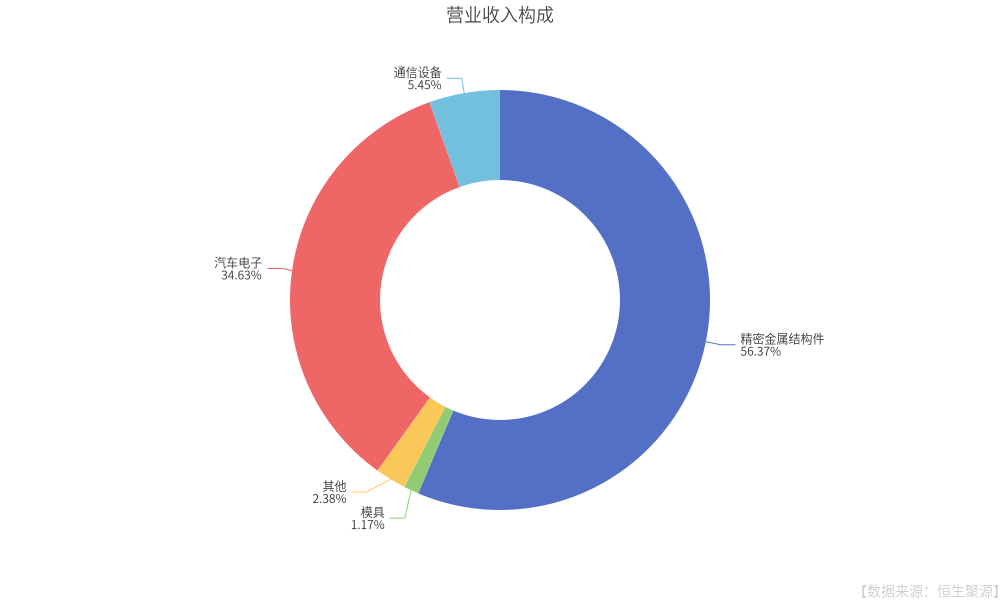 分产品来看,公司精密金属结构件收入11.89亿元,占比56.37%,同比增长5.29%;汽车电子收入7.31亿元,占比34.63%,同比增长31.61%;通信设备收入1.15亿元,占比5.44%,同比增长365.66%;模具收入0.25亿元,占比1.16%,同比下降16.94%;其他收入0.50亿元,占比2.37%,同比增长42.00%