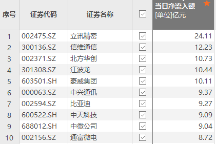 上证报中国证券网讯(记者徐蔚)Choice数据显示,4月27日,资金净流入额排名前十的个股依次是立讯精密、信维通信、北方华创、江波龙、豪威集团、中兴通讯、比亚迪、中天科技、中微公司、通富微电。其中,立讯精密获资金净流入24.11亿元。