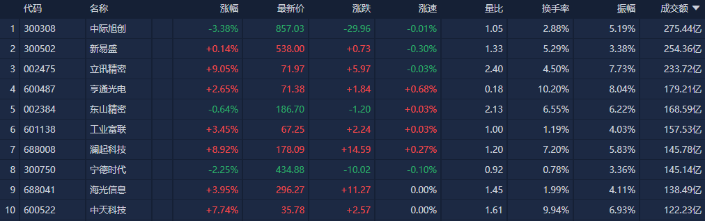 个股方面,中际旭创全天成交额超275亿元,位居沪深两市第一;新易盛、立讯精密成交额超200亿元。