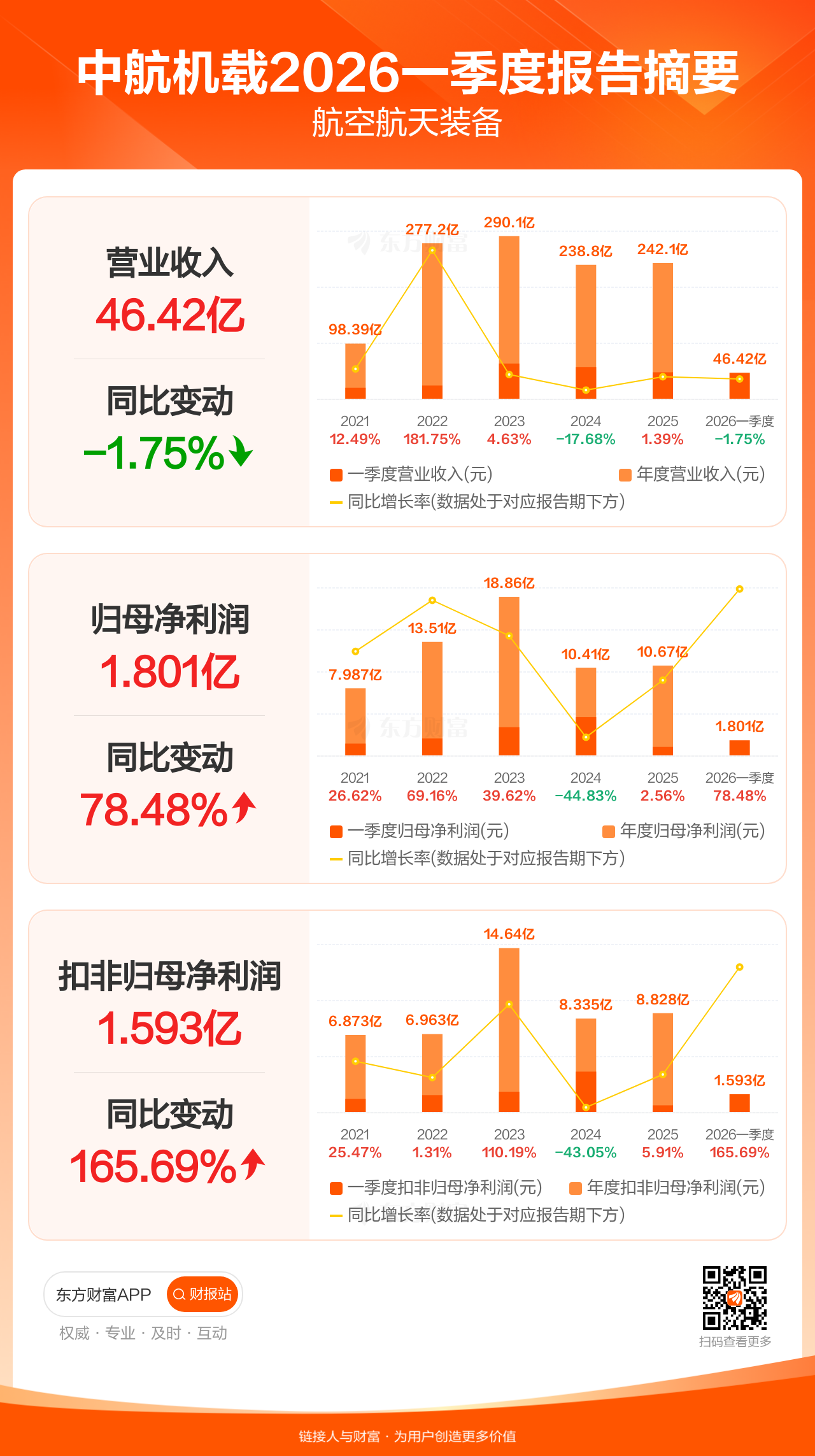 中航机载4月28日发布2026年一季报显示,公司一季度实现营业收入46.42亿元,同比下滑1.75%;归母净利润1.80亿元,同比增长78.48%;扣非归母净利润1.59亿元,同比增长165.69%。