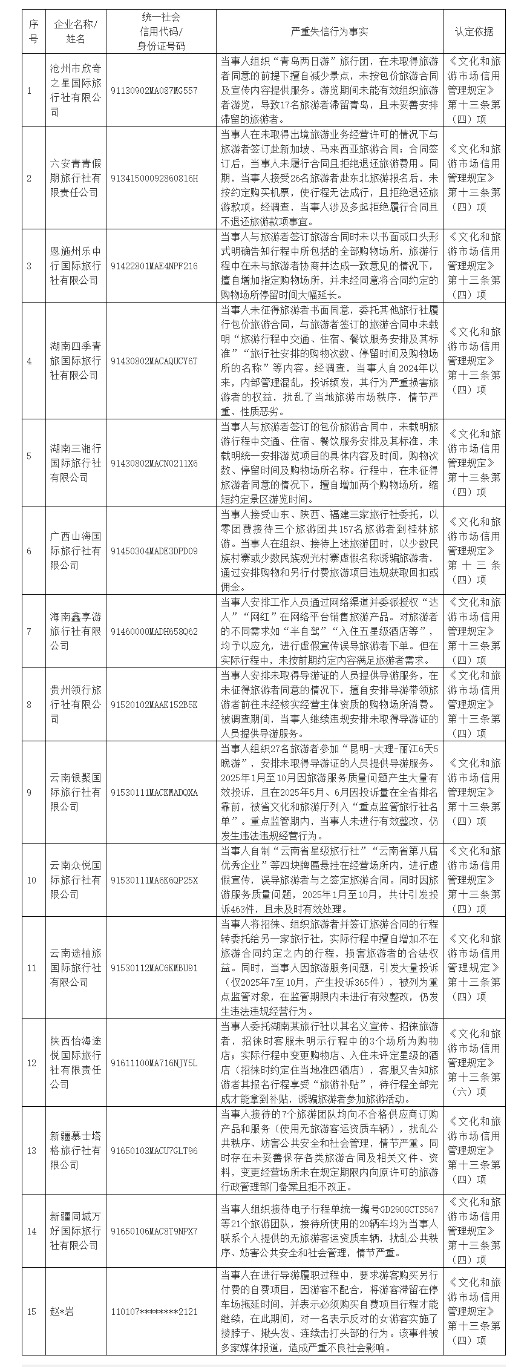 文旅部公布一批旅游市场严重失信主体典型名单:涉14家旅行社及1名导游