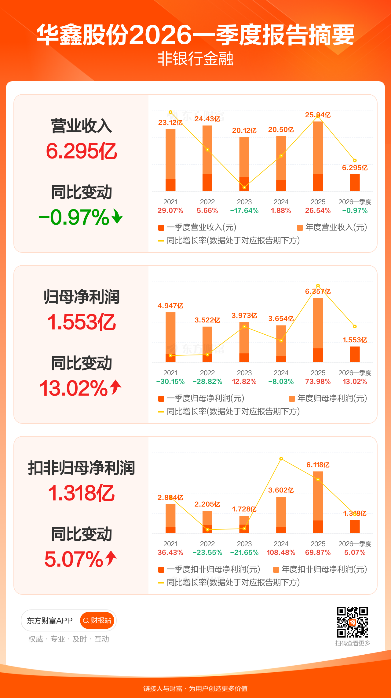 华鑫股份4月28日发布2026年一季报显示,公司一季度实现营业收入6.30亿元,同比下滑0.97%;归母净利润1.55亿元,同比增长13.02%;扣非归母净利润1.32亿元,同比增长5.07%。