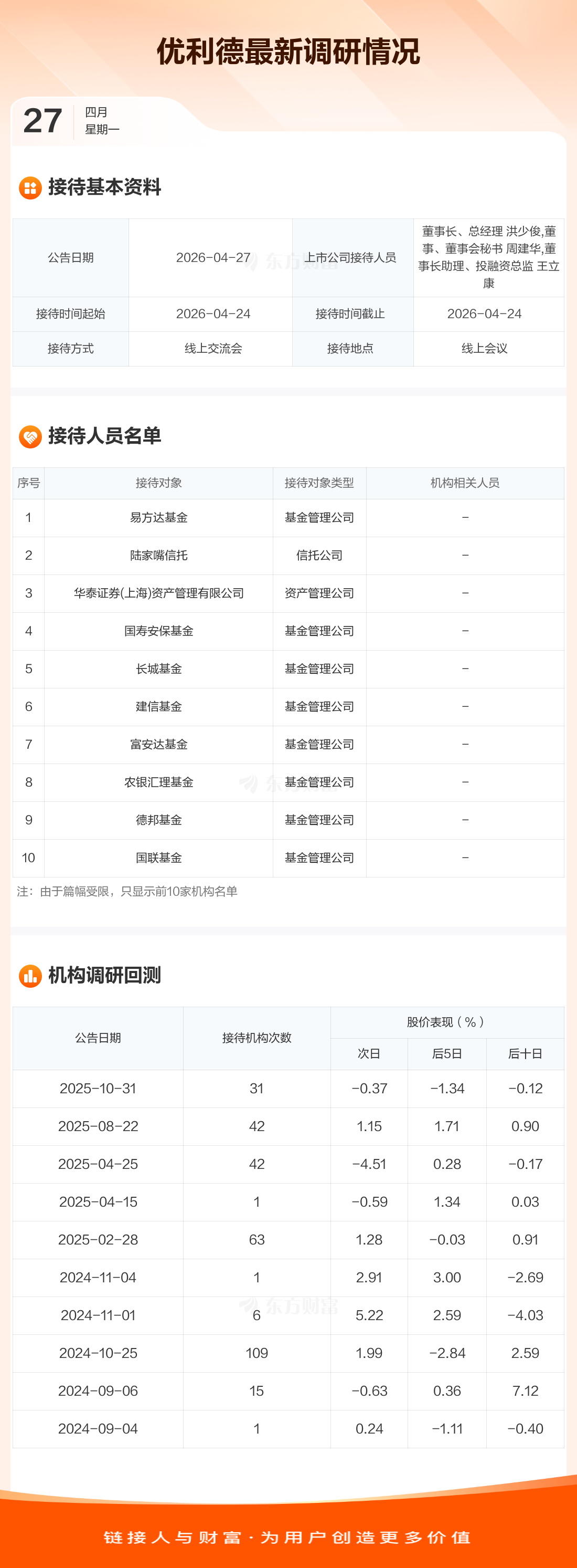 优利德4月27日公告称,4月24日接待易方达基金等59家机构调研。接待人员包括董事长、总经理 洪少俊,董事、董事会秘书 周建华,董事长助理、投融资总监 王立康。