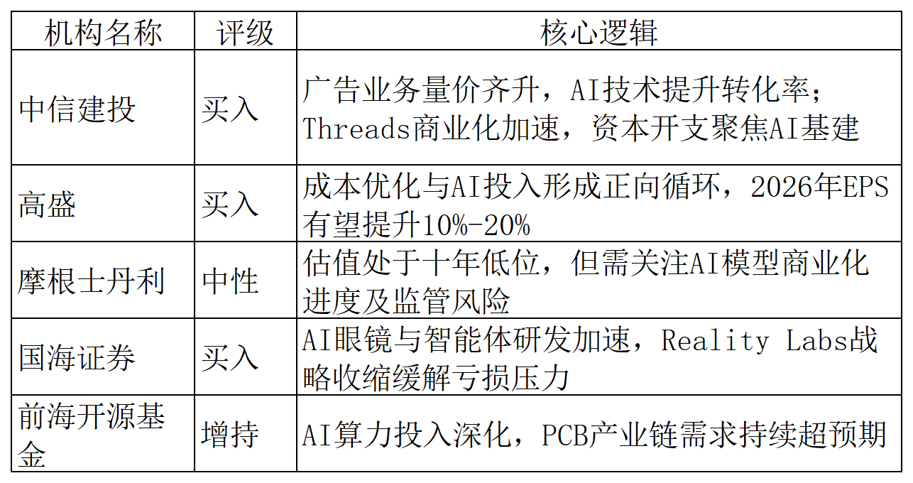新增长极的培育同样值得关注。Threads作为Meta对标Twitter(X)的社交产品,自推出以来用户增长势头强劲,月活用户已超4亿,并于2026年1月正式向全球开放广告投放。Evercore ISI甚至乐观预测,Threads到2026年底有望贡献113亿美元收入。不过,在即将发布的Q1财报中,Threads的广告收入大概率还不会单独列示,管理层对Threads商业化节奏的表态将成为关键信号——若明确加速变现计划,或进一步提振市场对Meta广告生态多元化的预期。