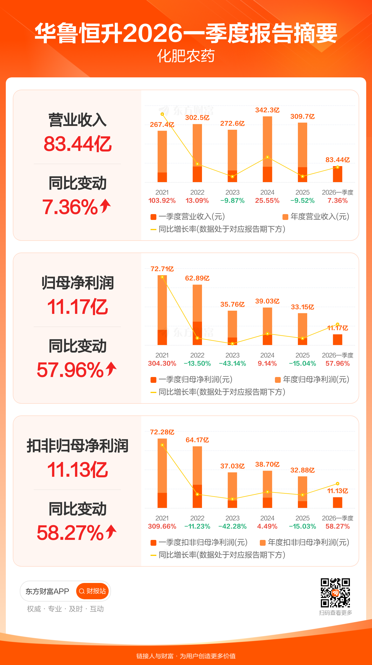 华鲁恒升4月28日发布2026年一季报显示,公司一季度实现营业收入83.44亿元,同比增长7.36%;归母净利润11.17亿元,同比增长57.96%;扣非归母净利润11.13亿元,同比增长58.27%。
