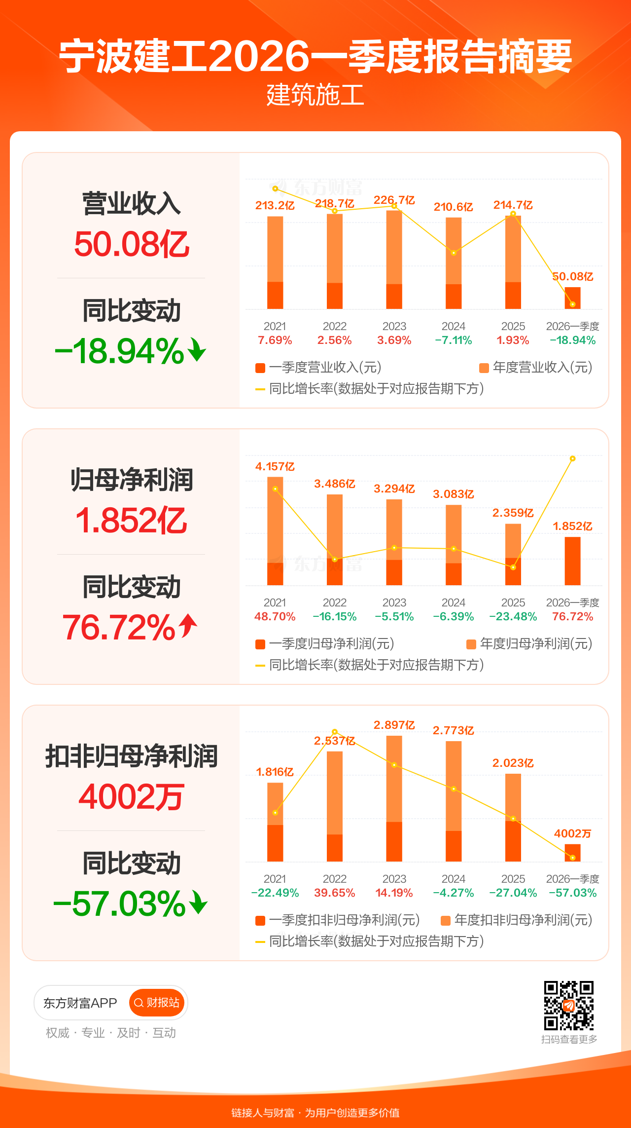 宁波建工4月28日发布2026年一季报显示,公司一季度实现营业收入50.08亿元,同比下滑18.94%;归母净利润1.85亿元,同比增长76.72%;扣非归母净利润4001.75万元,同比下滑57.03%。
