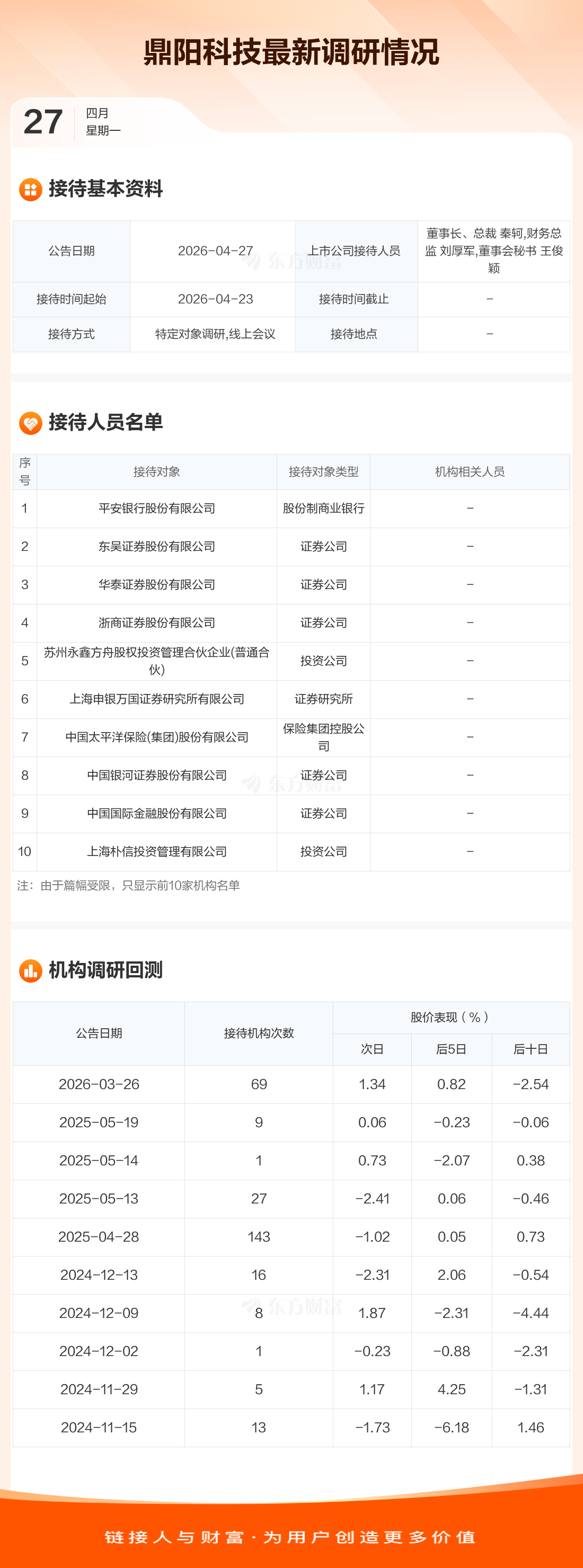 鼎阳科技4月27日公告称,4月23日接待平安银行股份有限公司等86家机构调研。接待人员包括董事长、总裁 秦轲,财务总监 刘厚军,董事会秘书 王俊颖。