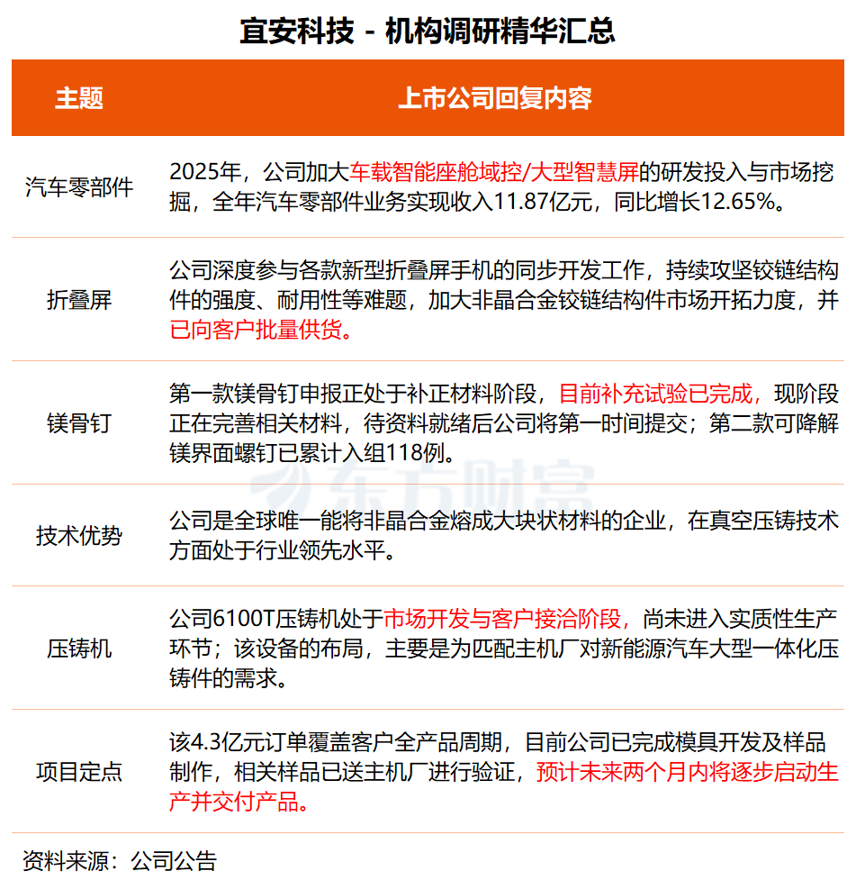 同时,宜安科技是全球范围最早布局大型镁铝合金压铸设备的企业之一,2025年,公司持续聚焦镁合金材料的轻量化与半固态压铸工艺的应用,加大了车载智能座舱域控/大型智慧屏的研发投入与产品市场挖掘,全年汽车零部件业务收入实现118,661.04万元,较上年同期增长12.65%。