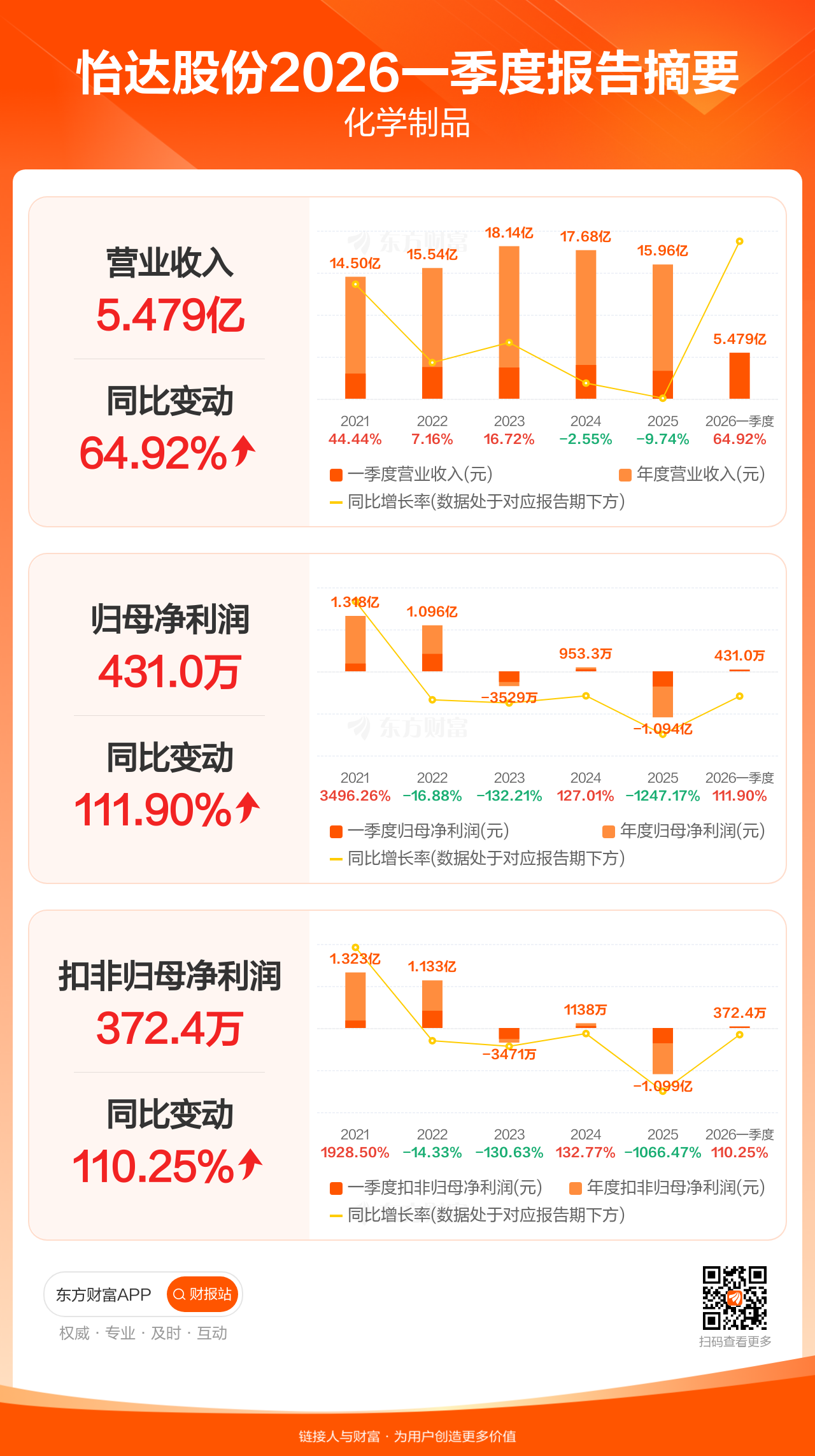 怡达股份4月28日发布2026年一季报显示,公司一季度实现营业收入5.48亿元,同比增长64.92%;归母净利润430.96万元,同比增长111.90%;扣非归母净利润372.41万元,同比增长110.25%。