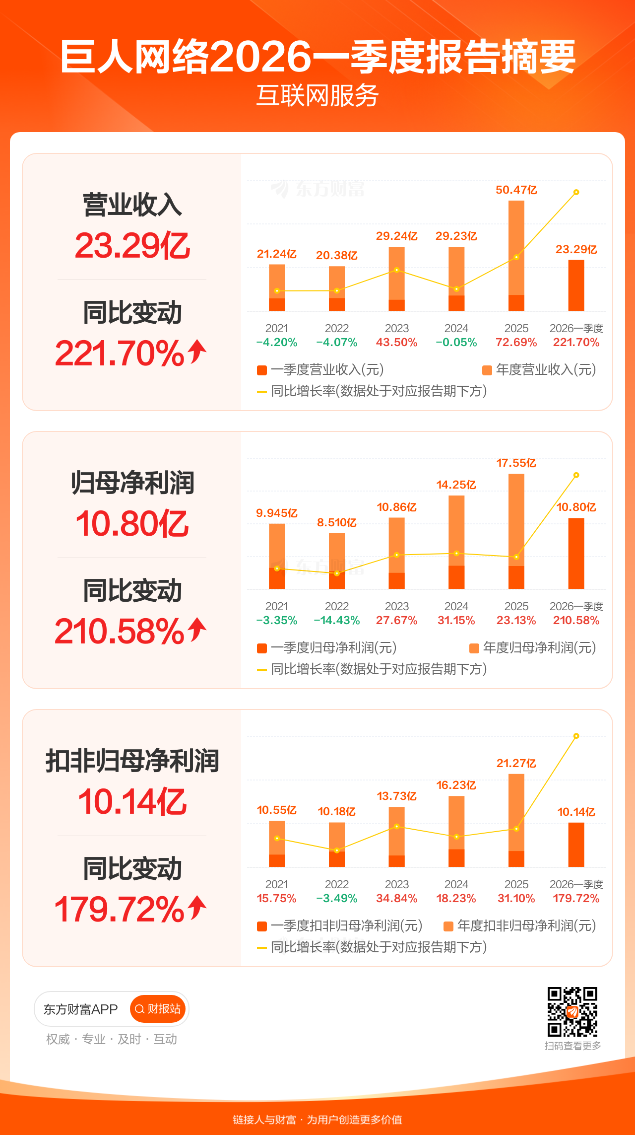 巨人网络4月28日发布2026年一季报显示,公司一季度实现营业收入23.29亿元,同比增长221.70%;归母净利润10.80亿元,同比增长210.58%;扣非归母净利润10.14亿元,同比增长179.72%。