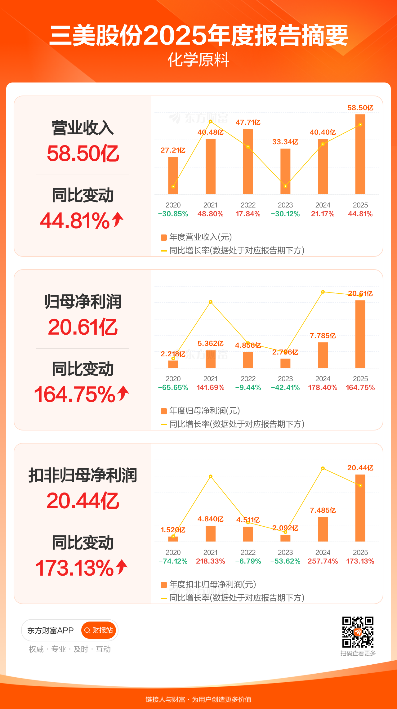 三美股份4月28日发布2025年年报显示,公司全年实现营业收入58.50亿元,同比增长44.81%;归母净利润20.61亿元,同比增长164.75%;扣非归母净利润20.44亿元,同比增长173.13%。