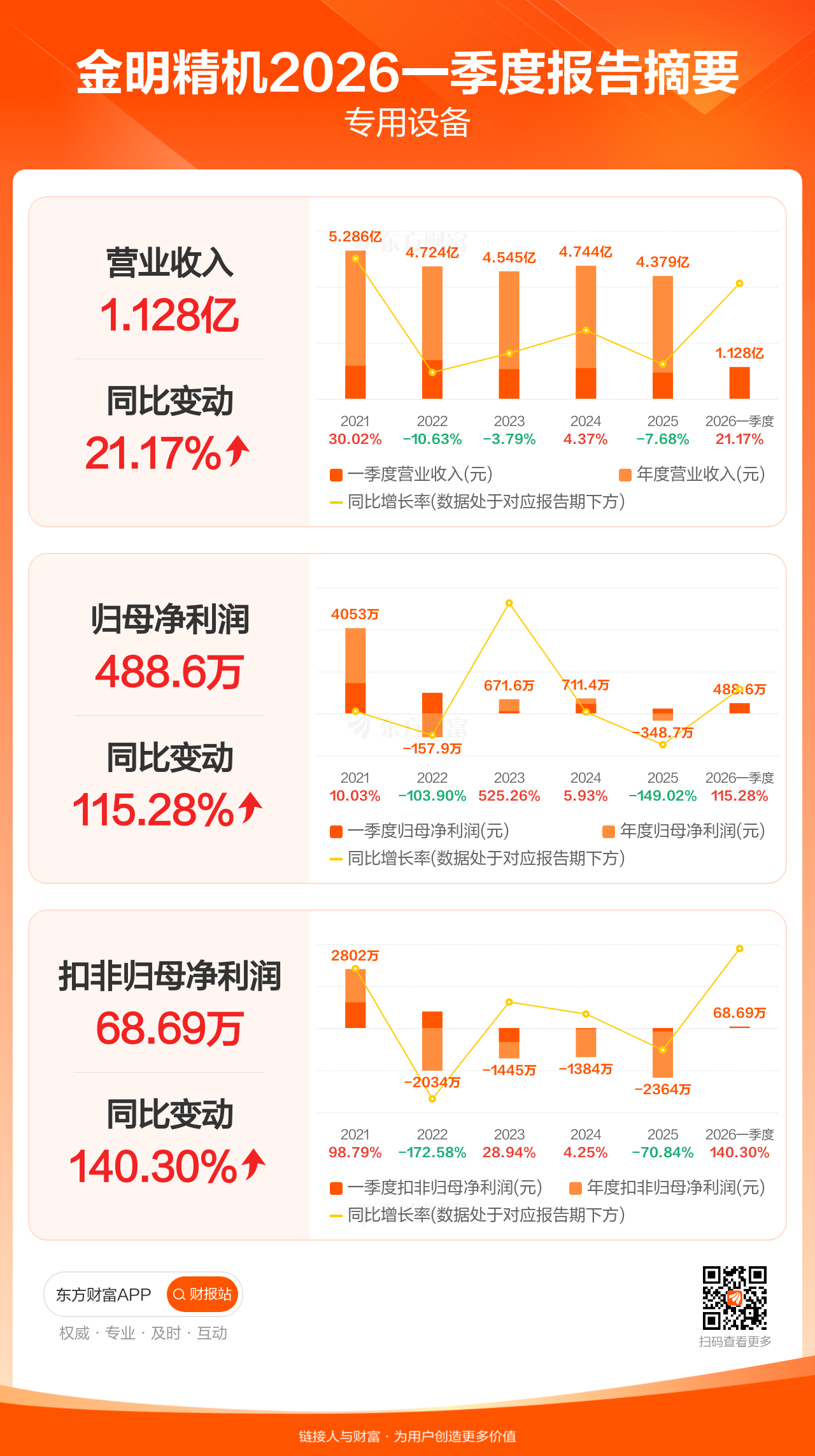 金明精机4月28日发布2026年一季报显示,公司一季度实现营业收入1.13亿元,同比增长21.17%;归母净利润488.59万元,同比增长115.28%;扣非归母净利润68.69万元,同比增长140.30%。