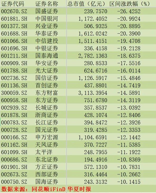 据同花顺iFinD统计显示,截至4月24日,2026年上市券商股价普跌,24家上市券商股价跌幅超10%,国盛证券跌幅超26%,位居第一;11家千亿市值头部券商中多家跌幅在10%以上,中国银河下跌20.99%,华泰证券下跌20.39%,中信建投下跌19.47%,国泰海通下跌18.63%,国信证券下跌15.48%,与行业业绩整体向好形成鲜明反差。