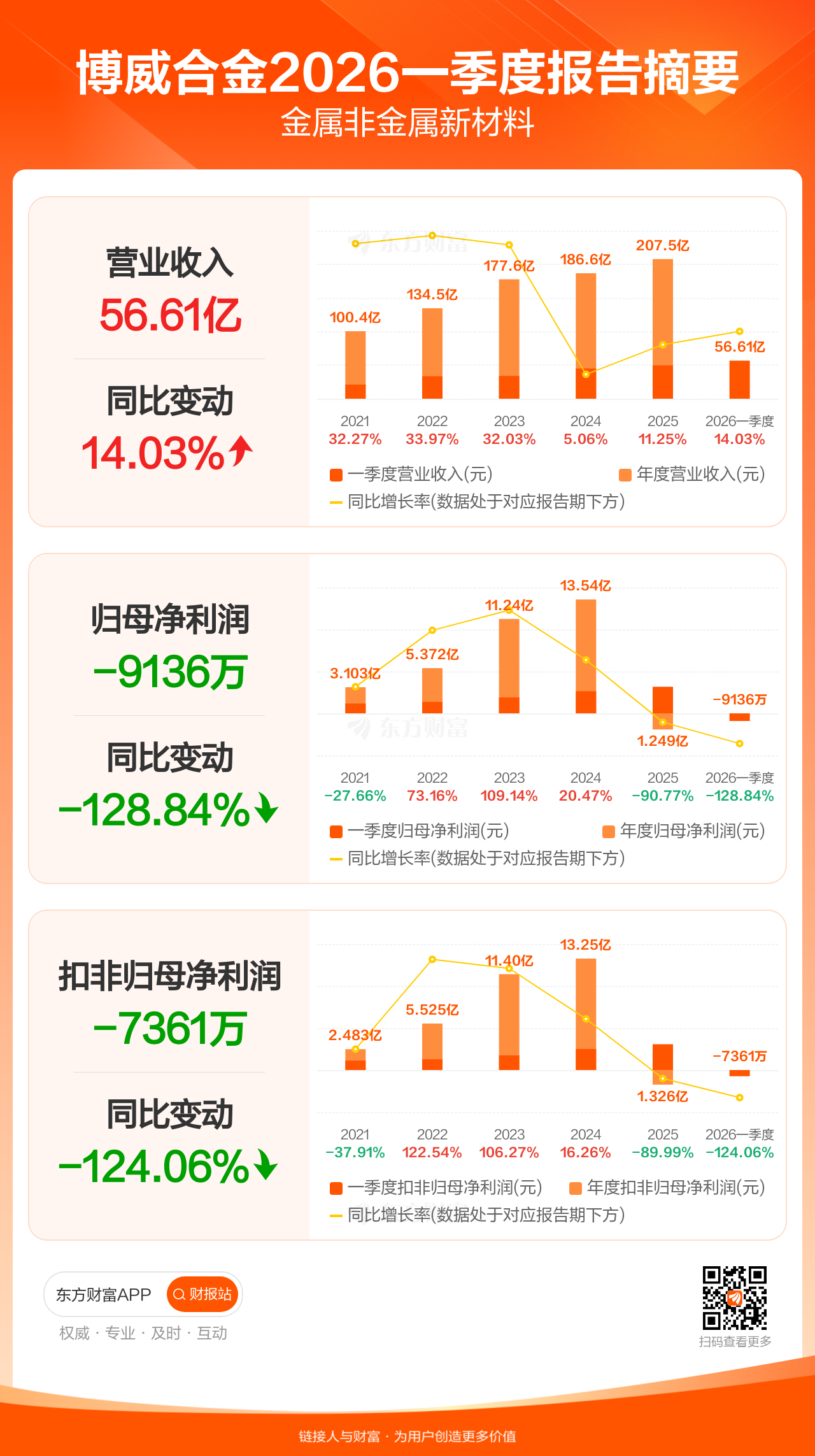 博威合金4月28日发布2026年一季报显示,公司一季度实现营业收入56.61亿元,同比增长14.03%;归母净利润-9135.98万元;扣非归母净利润-7360.67万元。