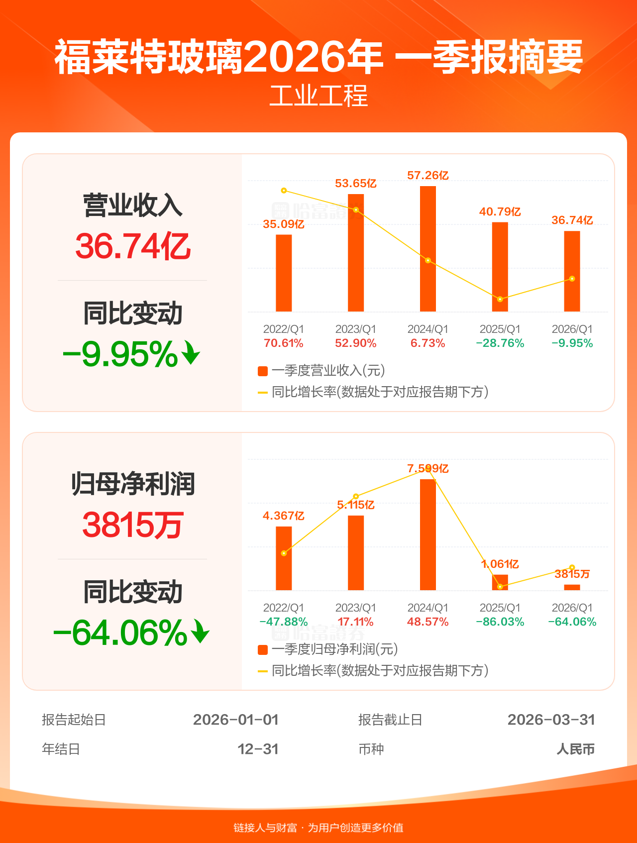 福莱特玻璃4月27日发布一季报业绩,截至2026年3月31日的3个月内,该公司营业收入36.74亿人民币,同比减少9.95%;公司权益持有人应占溢利(归母净利润)3814.65万人民币,同比减少64.06%。
