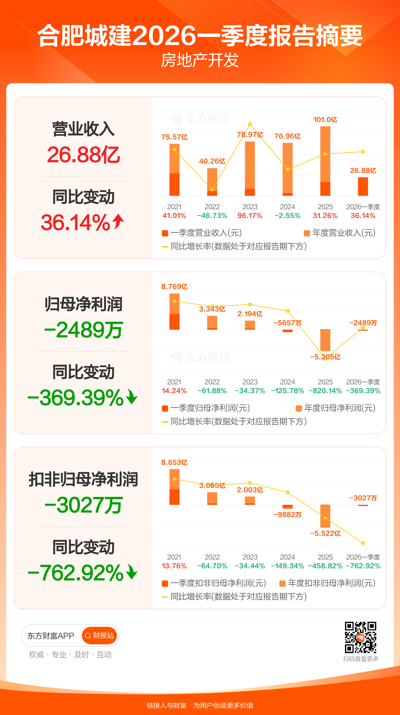 合肥城建4月28日发布2026年一季报显示,公司一季度实现营业收入26.88亿元,同比增长36.14%;归母净利润-2489.46万元;扣非归母净利润-3026.84万元。