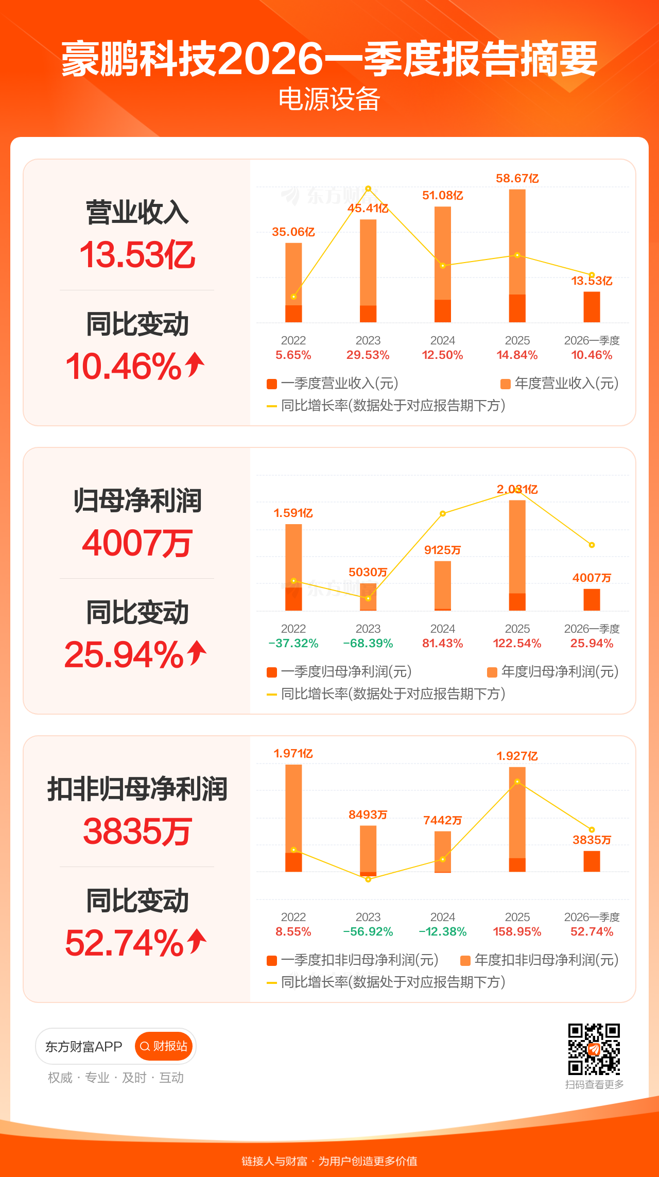 豪鹏科技4月28日发布2026年一季报显示,公司一季度实现营业收入13.53亿元,同比增长10.46%;归母净利润4006.64万元,同比增长25.94%;扣非归母净利润3834.61万元,同比增长52.74%。