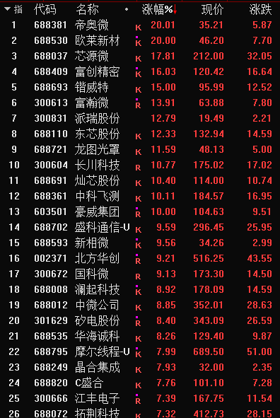 盘面看,194家半导体股165只收涨。帝奥微、欧莱新材拉出20%涨停,前者创出3年新高,后者创出上市以来的最高价;芯源微盘中20%涨停,富创精密突破历史新高。豪威集团涨停,另有8只芯片股劲升10%以上。