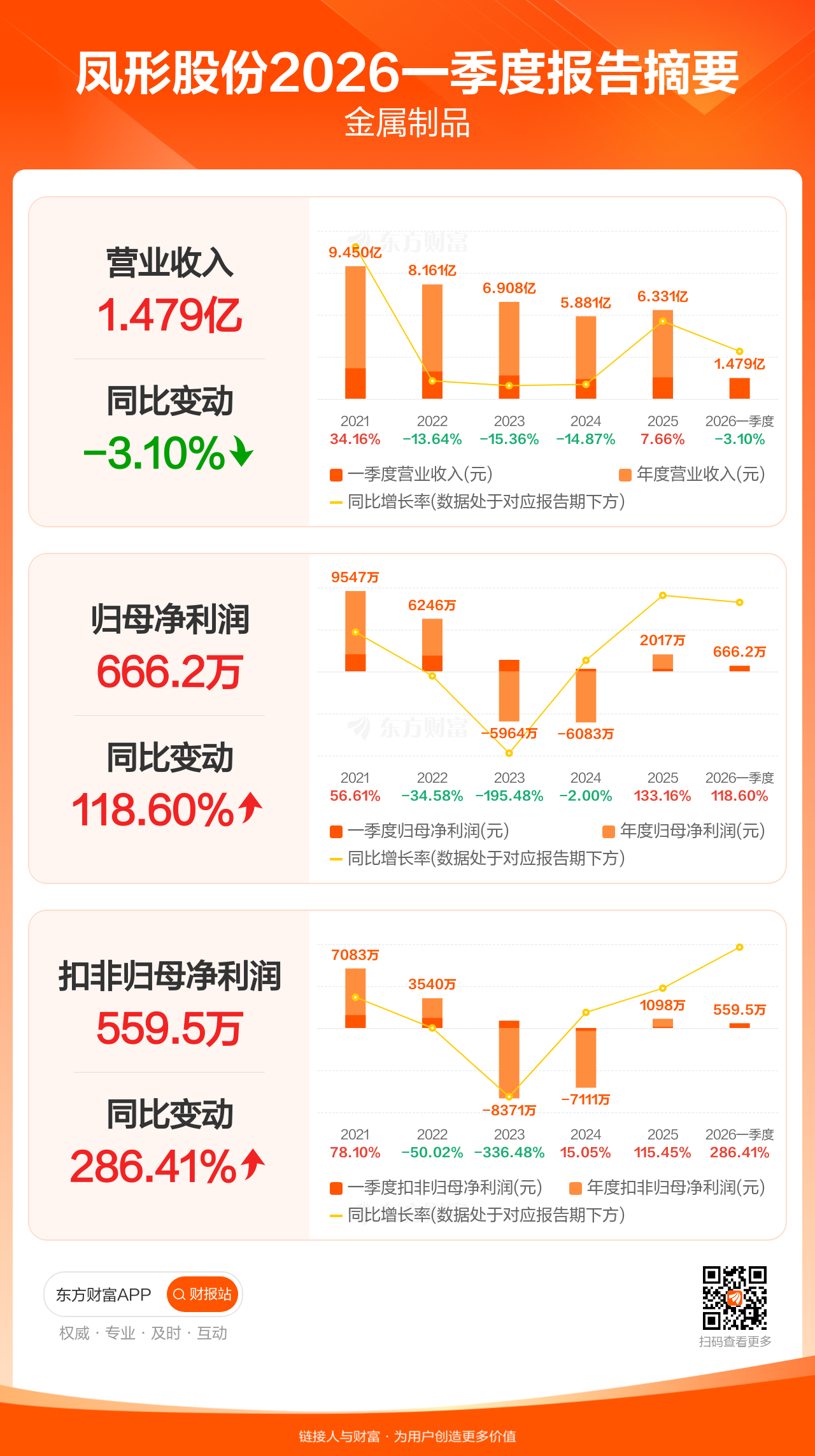 凤形股份4月28日发布2026年一季报显示,公司一季度实现营业收入1.48亿元,同比下滑3.10%;归母净利润666.17万元,同比增长118.60%;扣非归母净利润559.47万元,同比增长286.41%。