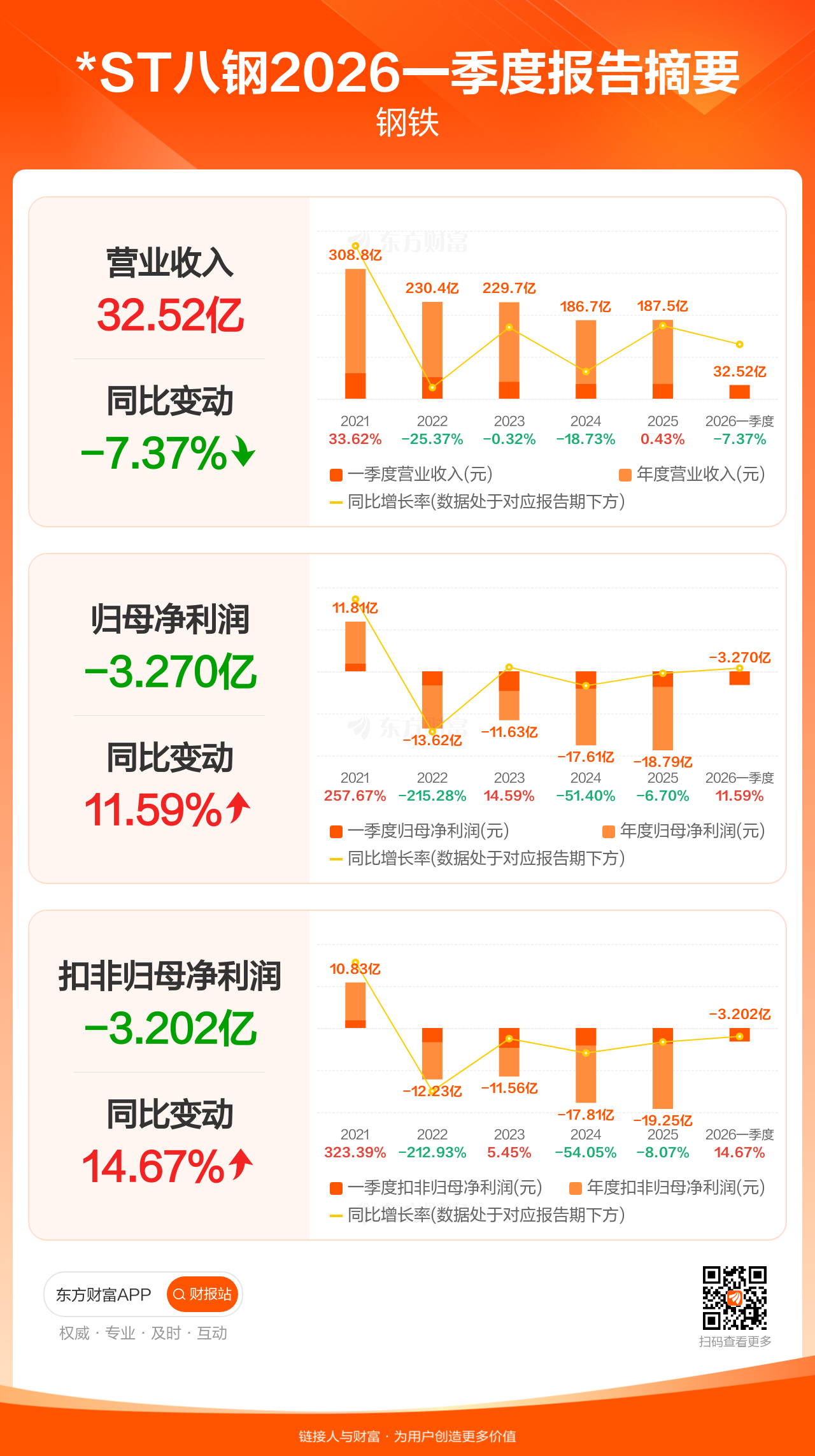 *ST八钢4月28日发布2026年一季报显示,公司一季度实现营业收入32.52亿元,同比下滑7.37%;归母净利润-3.27亿元;扣非归母净利润-3.20亿元。