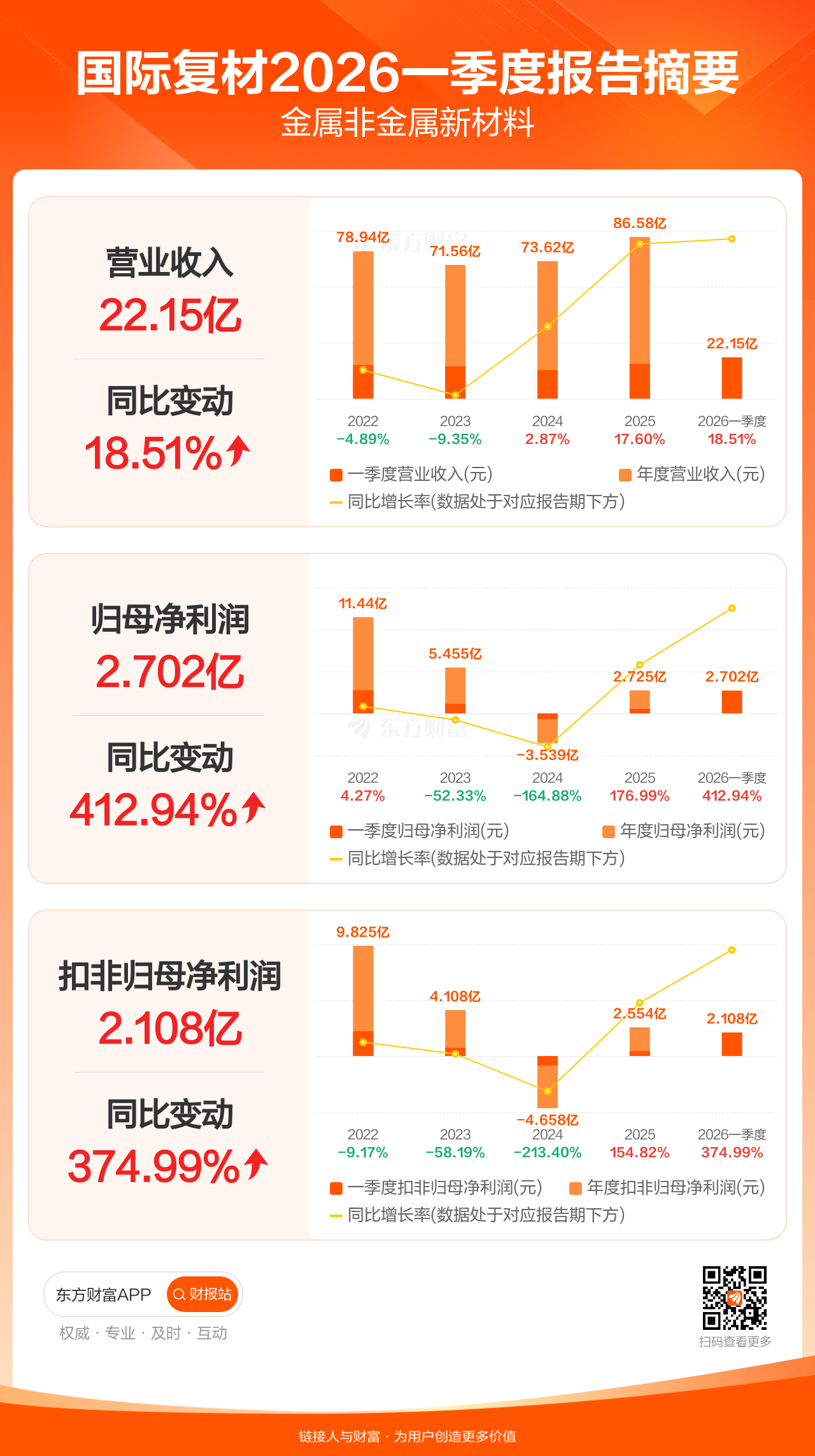 国际复材4月28日发布2026年一季报显示,公司一季度实现营业收入22.15亿元,同比增长18.51%;归母净利润2.70亿元,同比增长412.94%;扣非归母净利润2.11亿元,同比增长374.99%。
