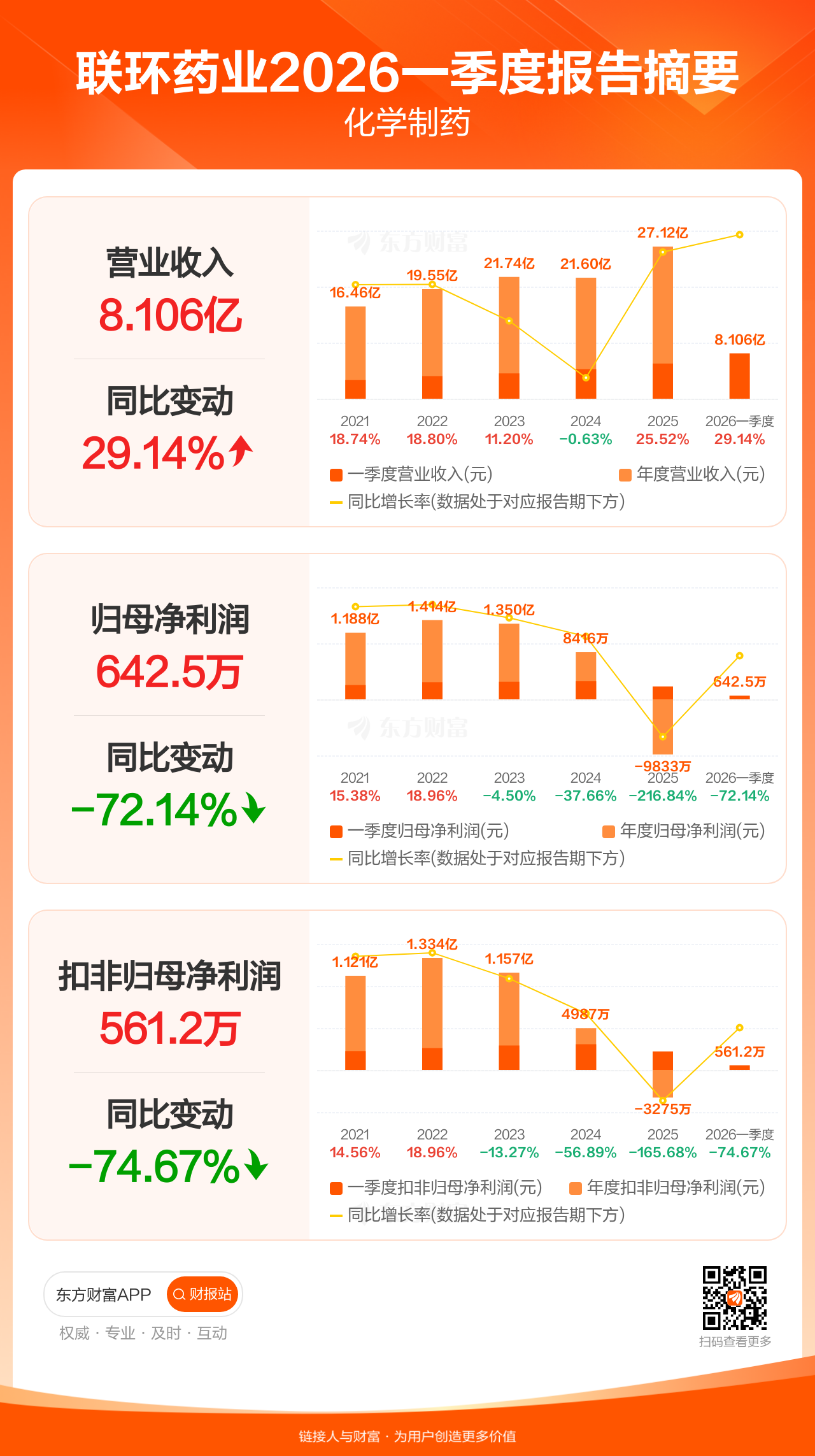 联环药业4月28日发布2026年一季报显示,公司一季度实现营业收入8.11亿元,同比增长29.14%;归母净利润642.48万元,同比下滑72.14%;扣非归母净利润561.16万元,同比下滑74.67%。