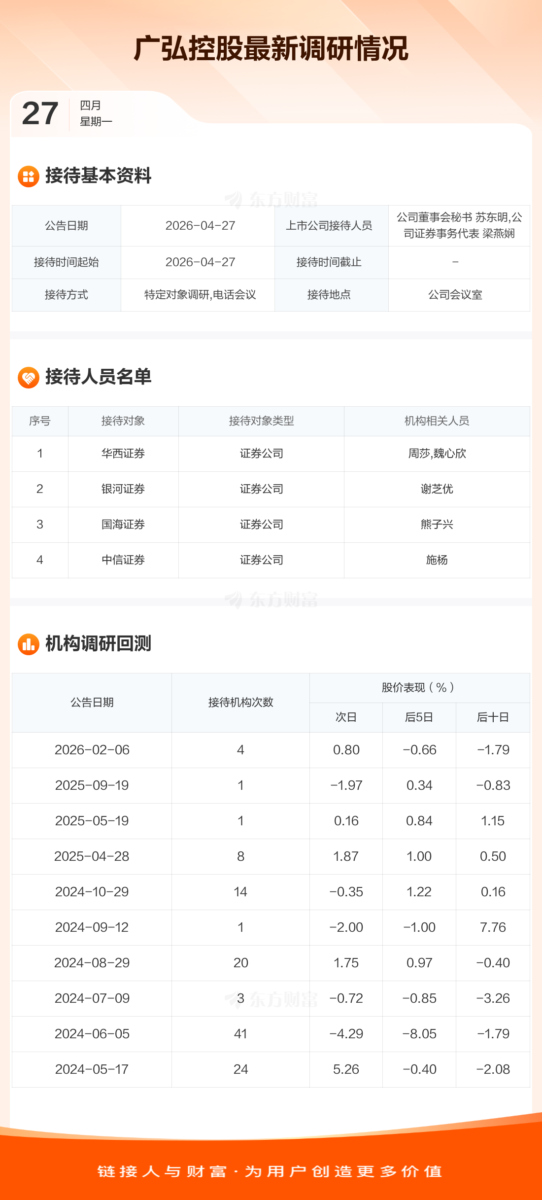 广弘控股4月27日公告称,4月27日接待华西证券等4家机构调研。接待人员包括公司董事会秘书 苏东明,公司证券事务代表 梁燕娴。