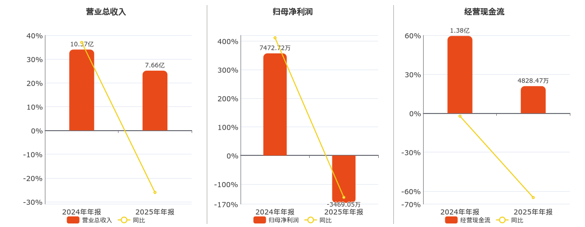 公司营业总收入为7.66亿元,在已披露的同业公司中排名第85,较去年同报告期营业总收入减少2.71亿元,同比较去年同期下降26.09%。归母净利润为-3469.05万元,在已披露的同业公司中排名第93,较去年同报告期归母净利润减少1.09亿元,同比较去年同期下降146.42%。经营活动现金净流入为4828.47万元,在已披露的同业公司中排名第78,较去年同报告期经营活动现金净流入减少8937.08万元,同比较去年同期下降64.92%。