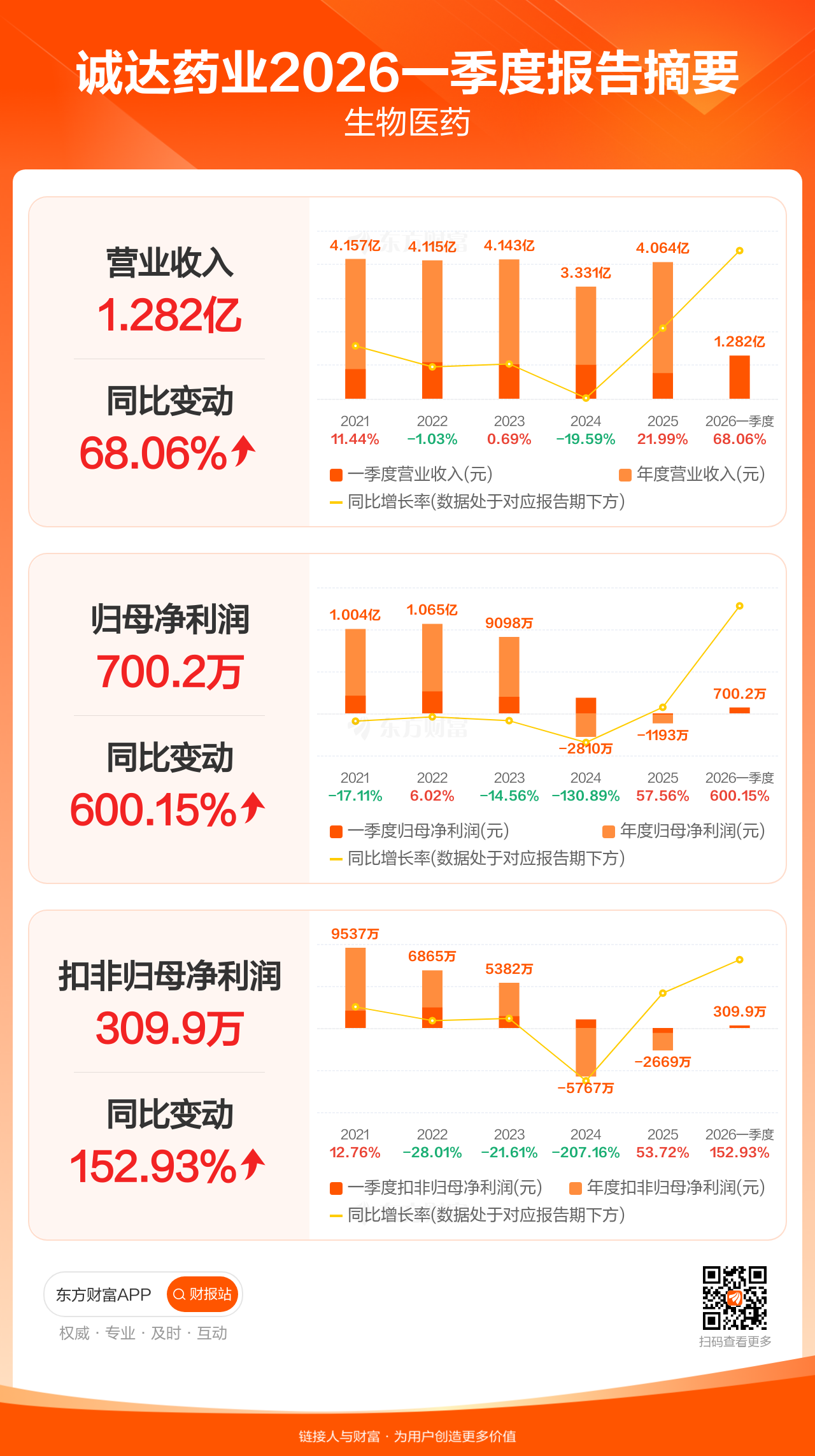 诚达药业4月28日发布2026年一季报显示,公司一季度实现营业收入1.28亿元,同比增长68.06%;归母净利润700.20万元,同比增长600.15%;扣非归母净利润309.86万元,同比增长152.93%。