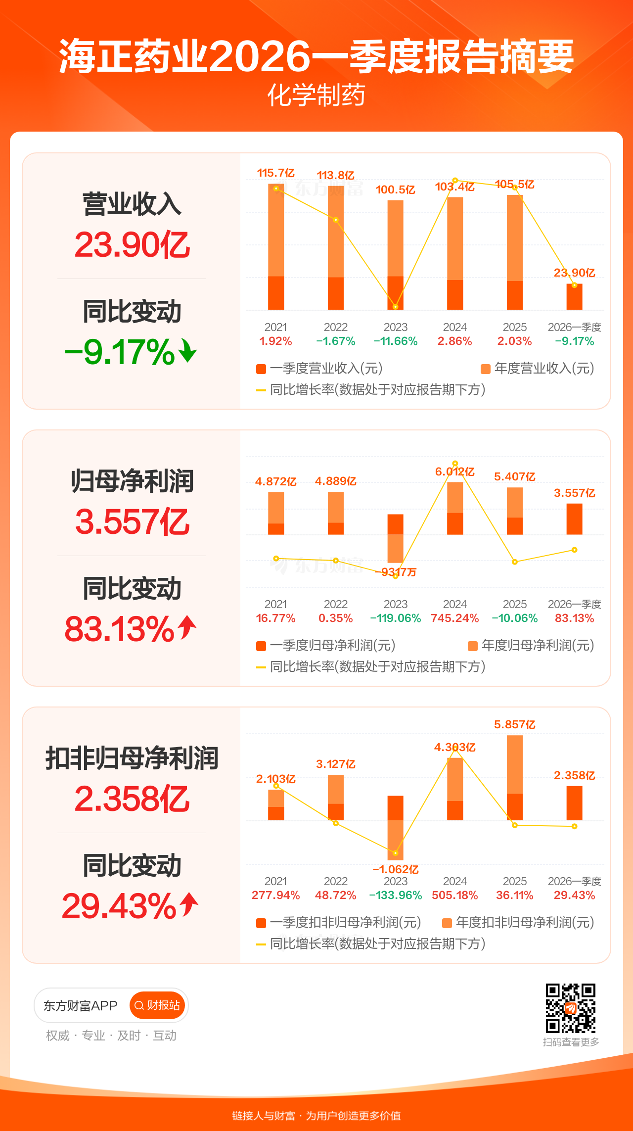 海正药业4月28日发布2026年一季报显示,公司一季度实现营业收入23.90亿元,同比下滑9.17%;归母净利润3.56亿元,同比增长83.13%;扣非归母净利润2.36亿元,同比增长29.43%。