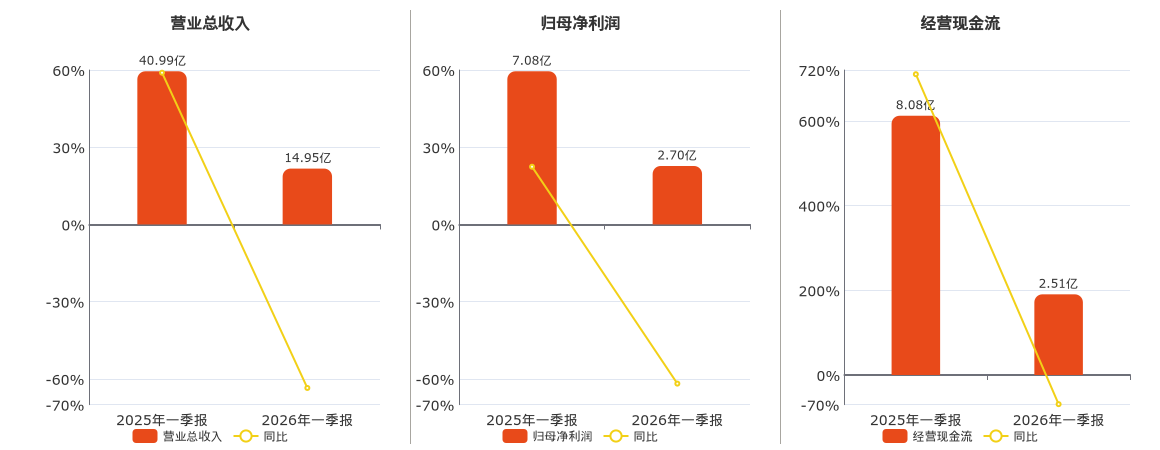 公司营业总收入为14.95亿元,较去年同报告期营业总收入减少26.04亿元,同比较去年同期下降63.52%。归母净利润为2.70亿元,较去年同报告期归母净利润减少4.38亿元,同比较去年同期下降61.83%。经营活动现金净流入为2.51亿元,较去年同报告期经营活动现金净流入减少5.56亿元,同比较去年同期下降68.89%。