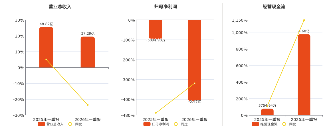 公司营业总收入为37.29亿元,较去年同报告期营业总收入减少11.52亿元,同比较去年同期下降23.60%。归母净利润为-2.47亿元,较去年同报告期归母净利润减少1.88亿元。经营活动现金净流入为4.68亿元。