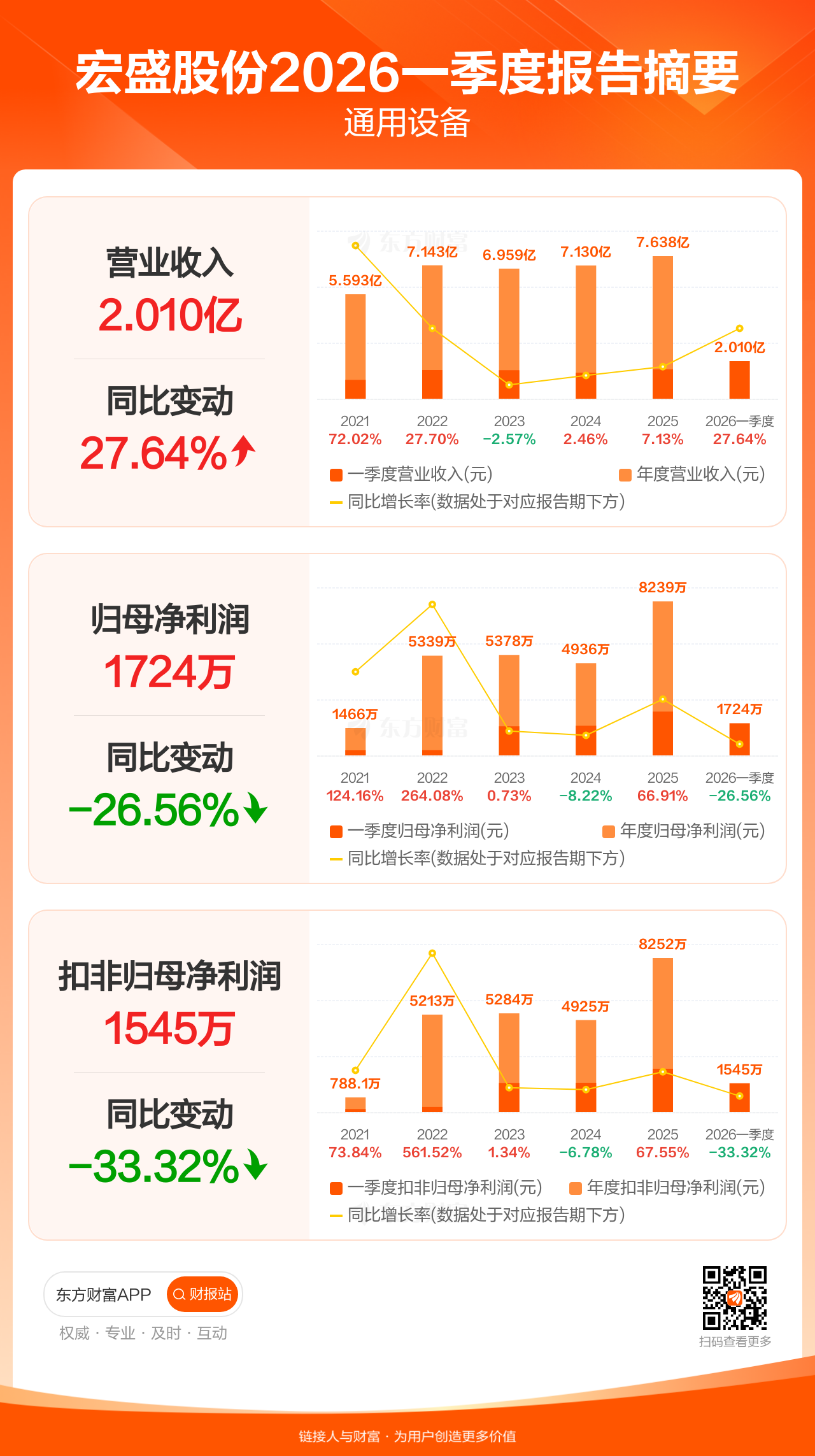 宏盛股份4月28日发布2026年一季报显示,公司一季度实现营业收入2.01亿元,同比增长27.64%;归母净利润1723.55万元,同比下滑26.56%;扣非归母净利润1544.75万元,同比下滑33.32%。
