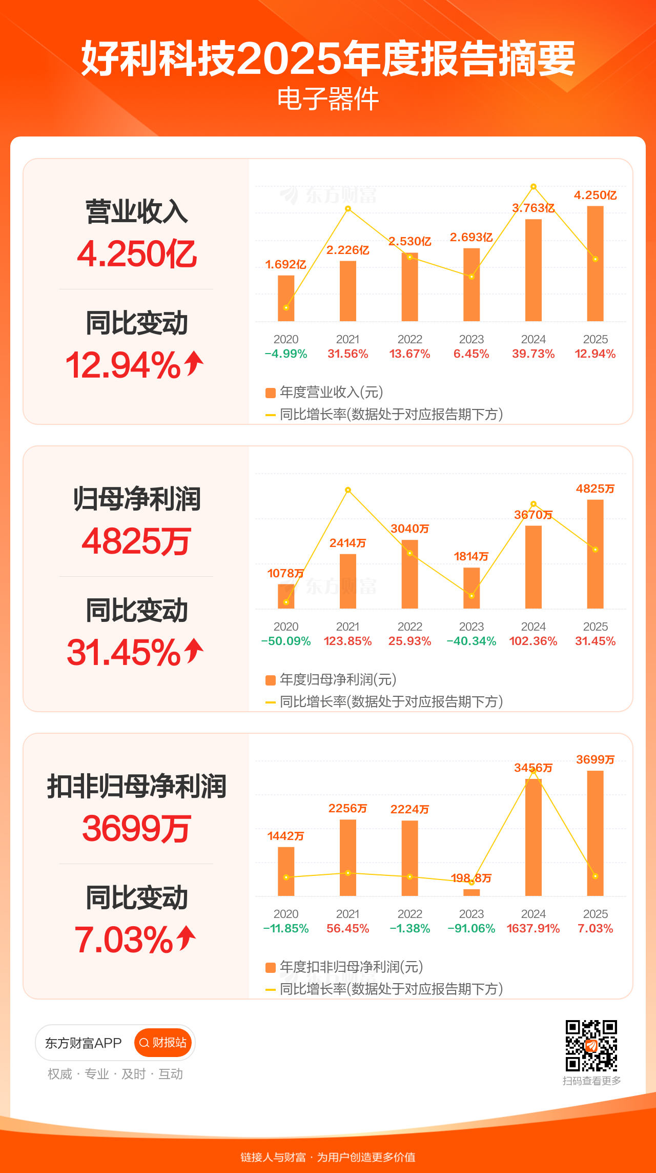好利科技4月28日发布2025年年报显示,公司全年实现营业收入4.25亿元,同比增长12.94%;归母净利润4824.54万元,同比增长31.45%;扣非归母净利润3698.67万元,同比增长7.03%。