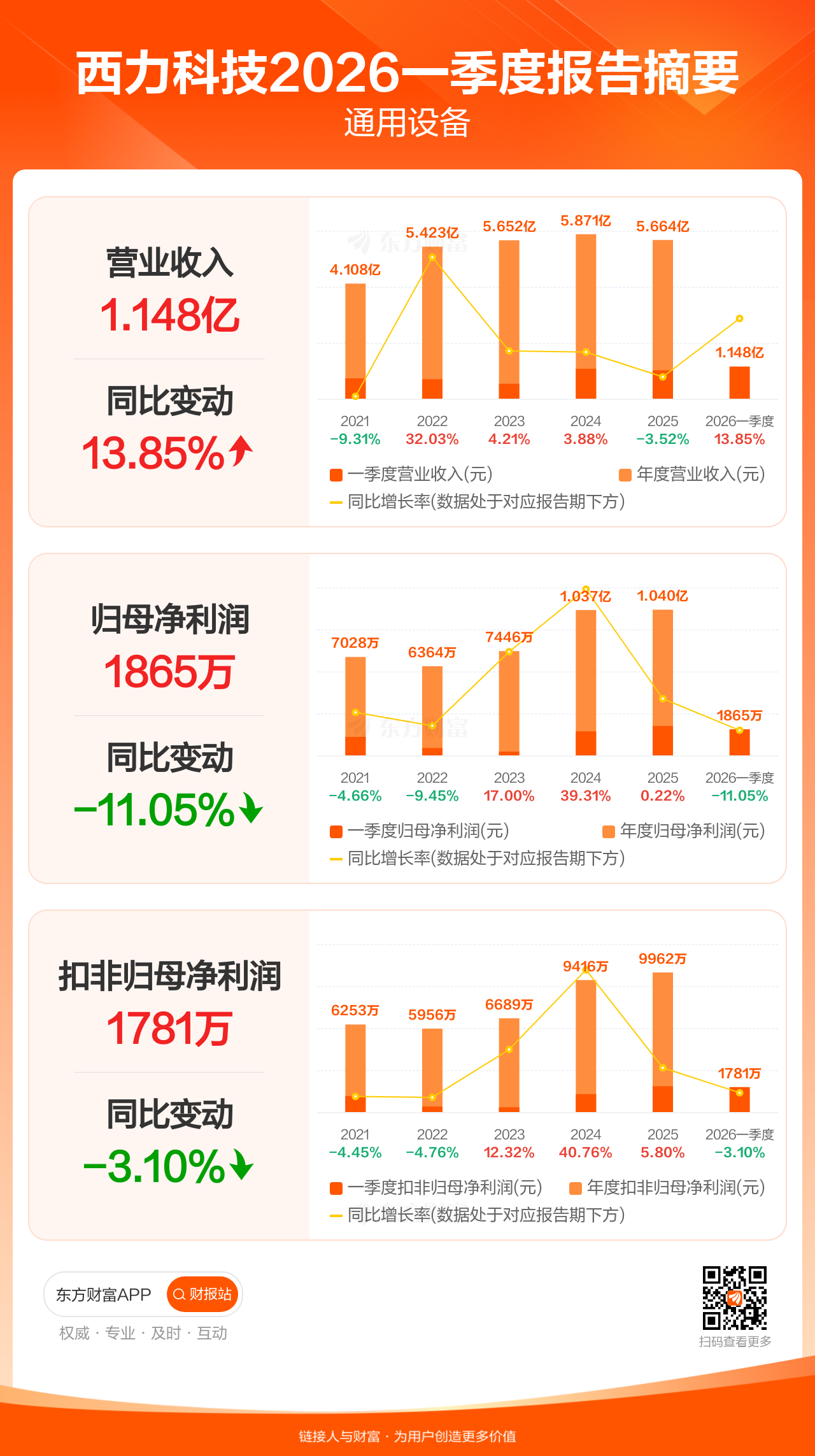 西力科技4月28日发布2026年一季报显示,公司一季度实现营业收入1.15亿元,同比增长13.85%;归母净利润1865.31万元,同比下滑11.05%;扣非归母净利润1780.69万元,同比下滑3.10%。