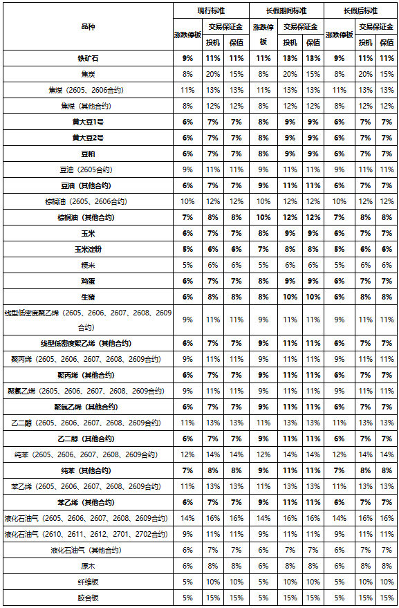 对同时满足《大连商品交易所风险管理办法》有关调整涨跌停板幅度和交易保证金规定的合约,其涨跌停板幅度和交易保证金按照规定数值中较大值执行。各品种2605合约进入交割月按照交割月交易保证金标准执行。