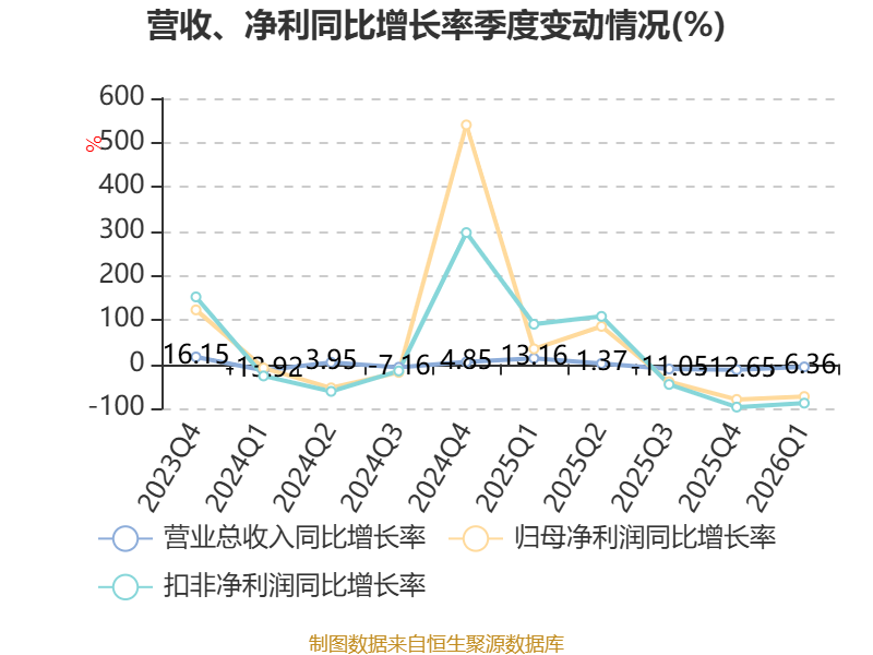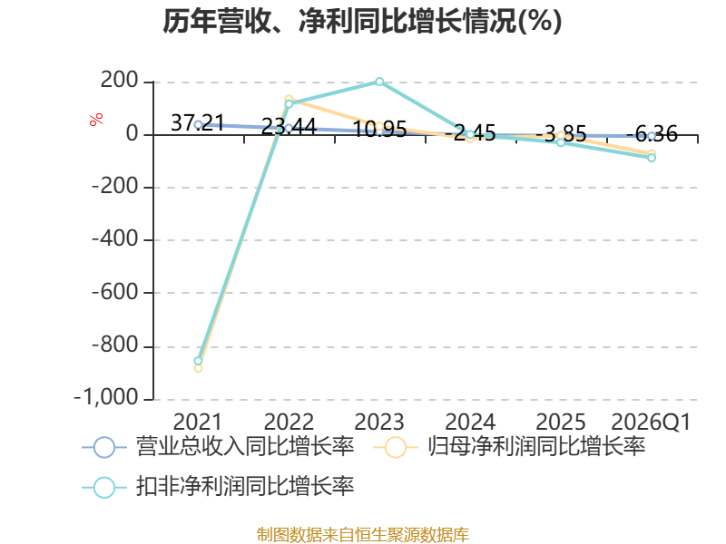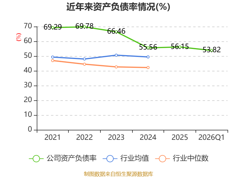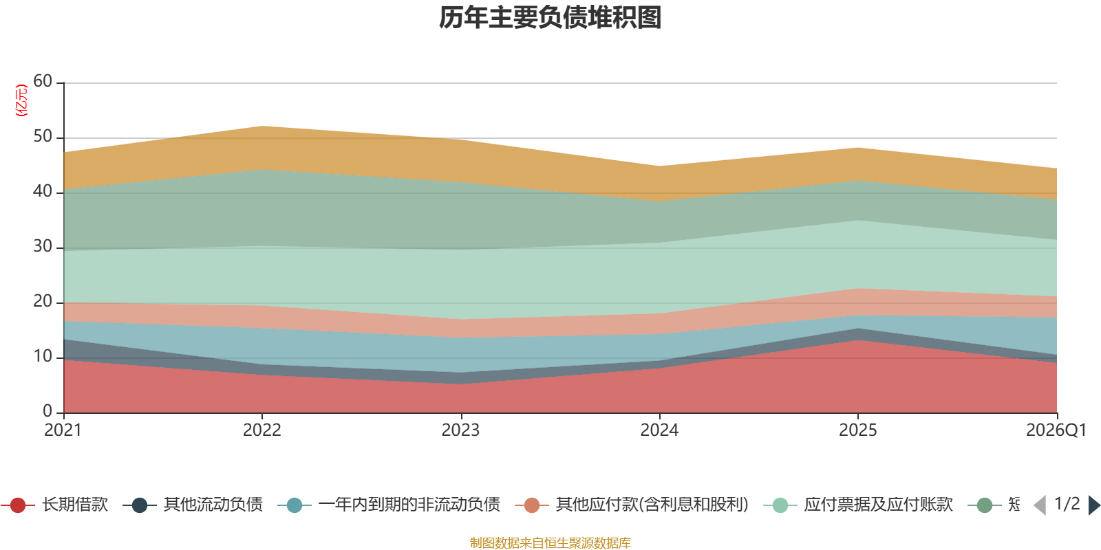 负债重大变化方面,截至2026年一季度末,公司一年内到期的非流动负债较上年末增加186.9%,占公司总资产比重上升5.48个百分点;长期借款较上年末减少31.46%,占公司总资产比重下降4.4个百分点;应付票据及应付账款较上年末减少16.55%,占公司总资产比重下降1.9个百分点;其他应付款(含利息和股利)较上年末减少22.25%,占公司总资产比重下降1.09个百分点。
