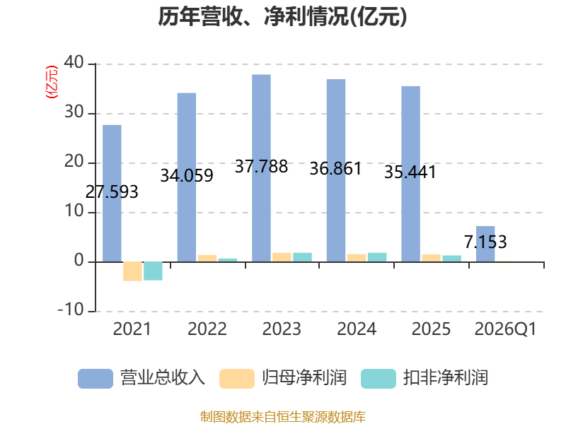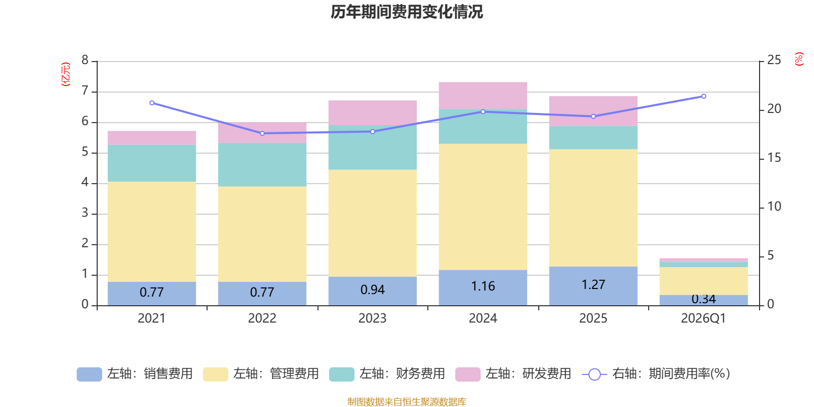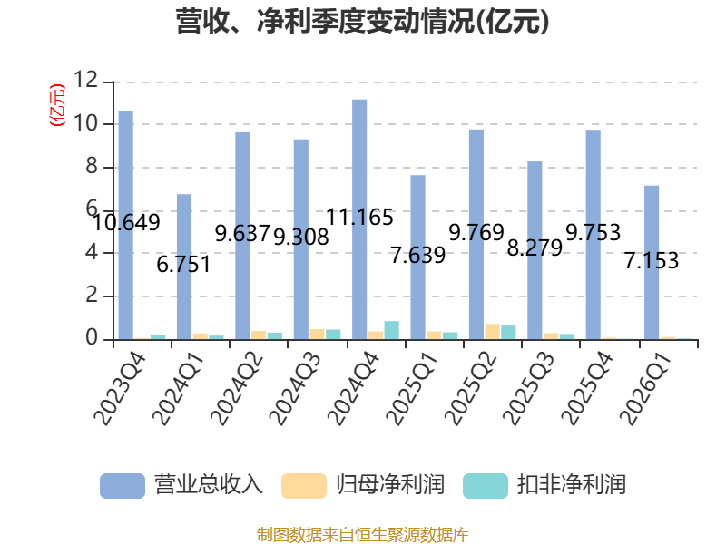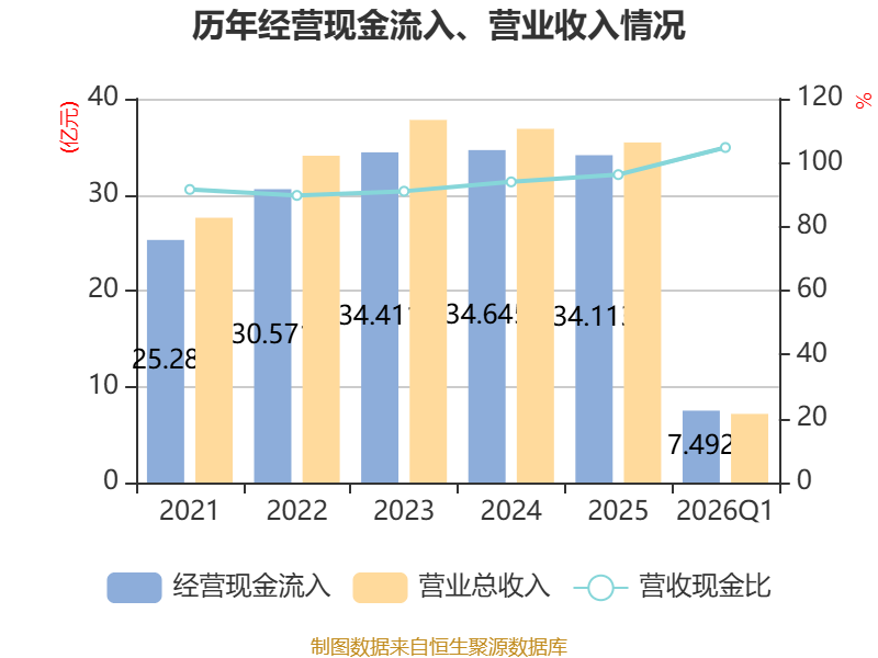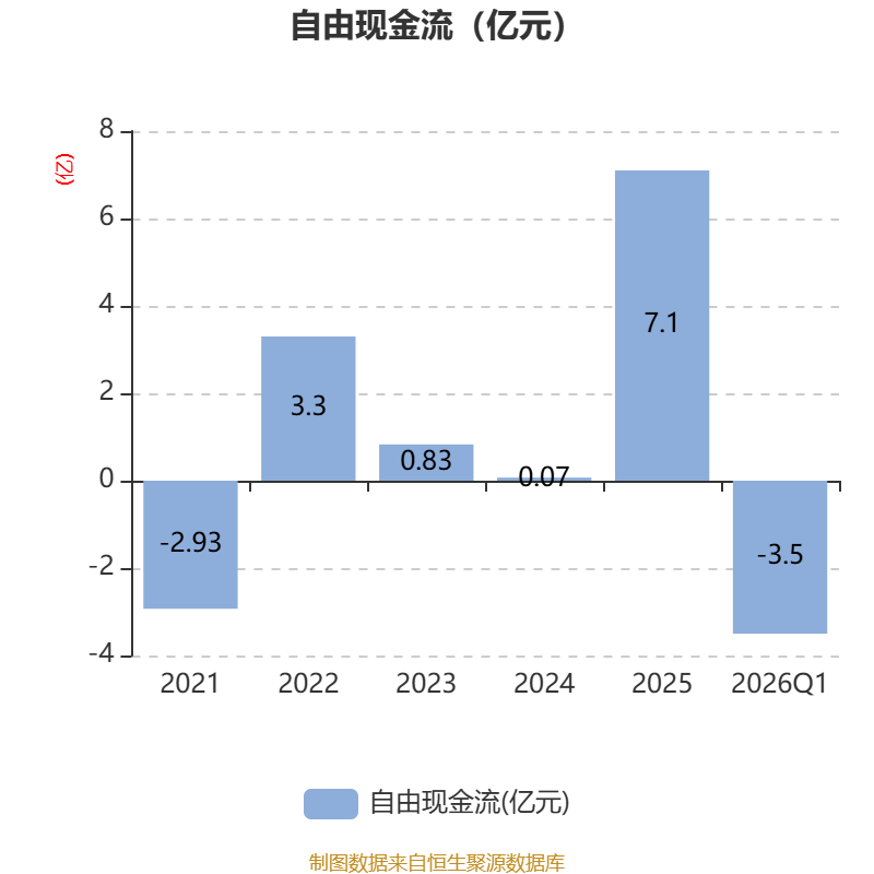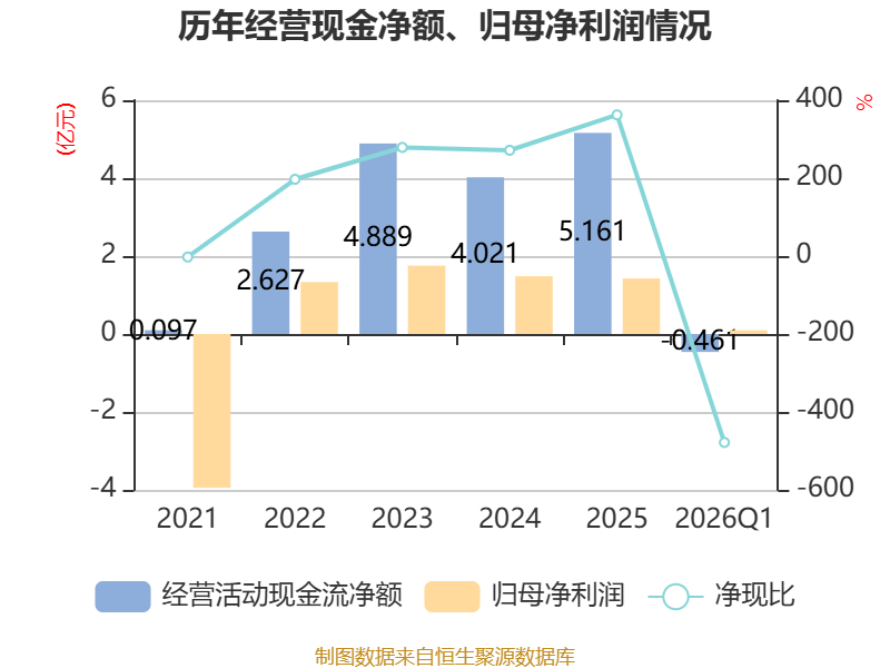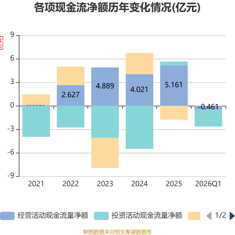 截至2026年一季度末,公司经营活动现金流净额为-4614.03万元,同比减少9829.42万元;筹资活动现金流净额280.17万元,同比减少2.24亿元;投资活动现金流净额-2.18亿元,上年同期为-4449.57万元。