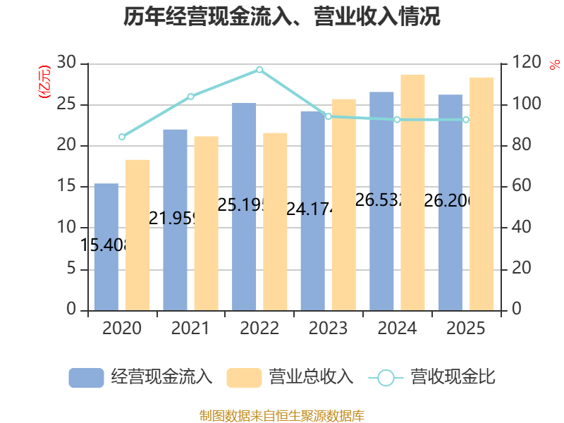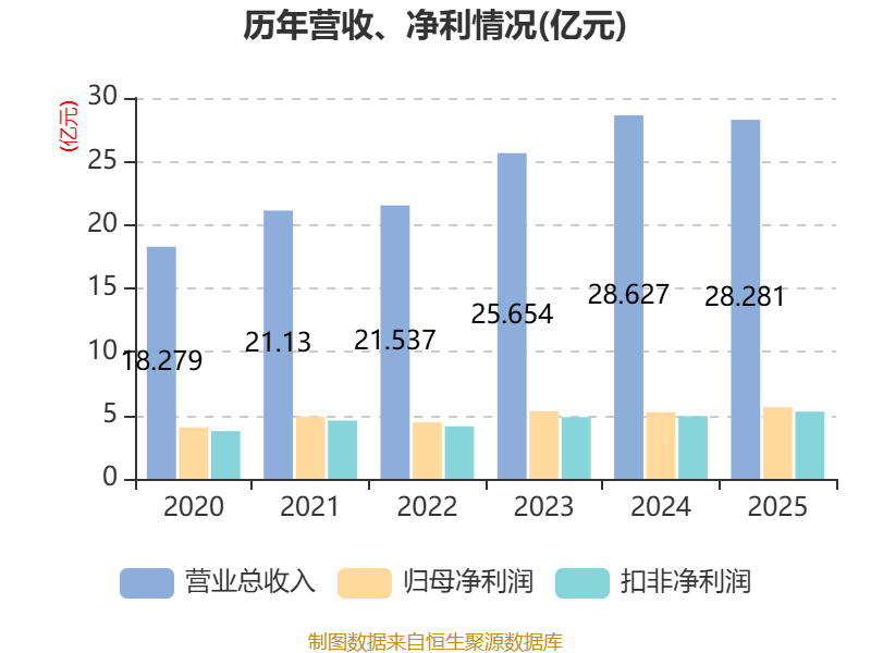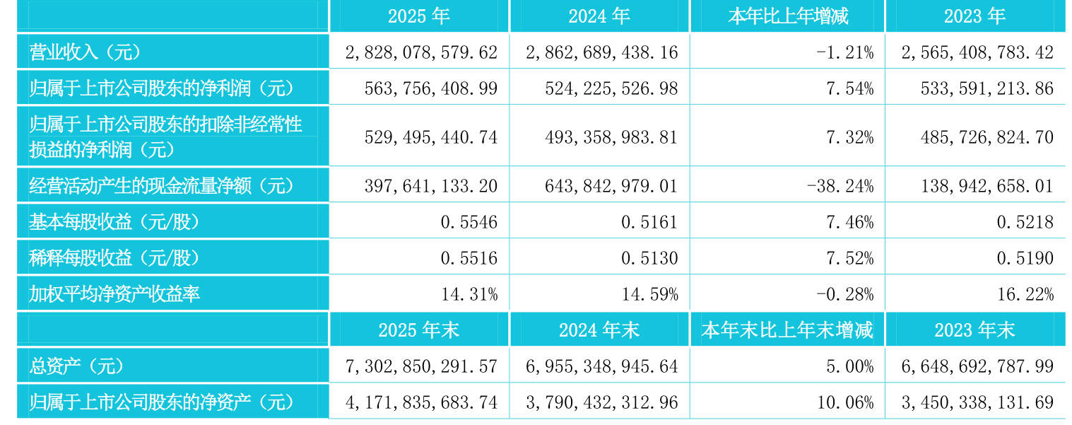 中证智能财讯博实股份(002698)4月28日披露2025年年度报告。2025年,公司实现营业总收入28.28亿元,同比下降1.21%;归母净利润5.64亿元,同比增长7.54%;扣非净利润5.29亿元,同比增长7.32%;经营活动产生的现金流量净额为3.98亿元,同比下降38.24%;报告期内,博实股份基本每股收益为0.5546元,加权平均净资产收益率为14.31%。公司2025年度分配预案为:拟向全体股东每10股派现2.5元(含税)。