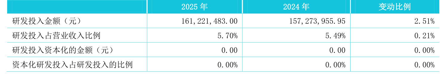 2025年全年,公司研发投入金额为1.61亿元,同比增长2.51%;研发投入占营业收入比例为5.7%,相比上年同期上升0.21个百分点。此外,公司全年研发投入资本化率为0%。