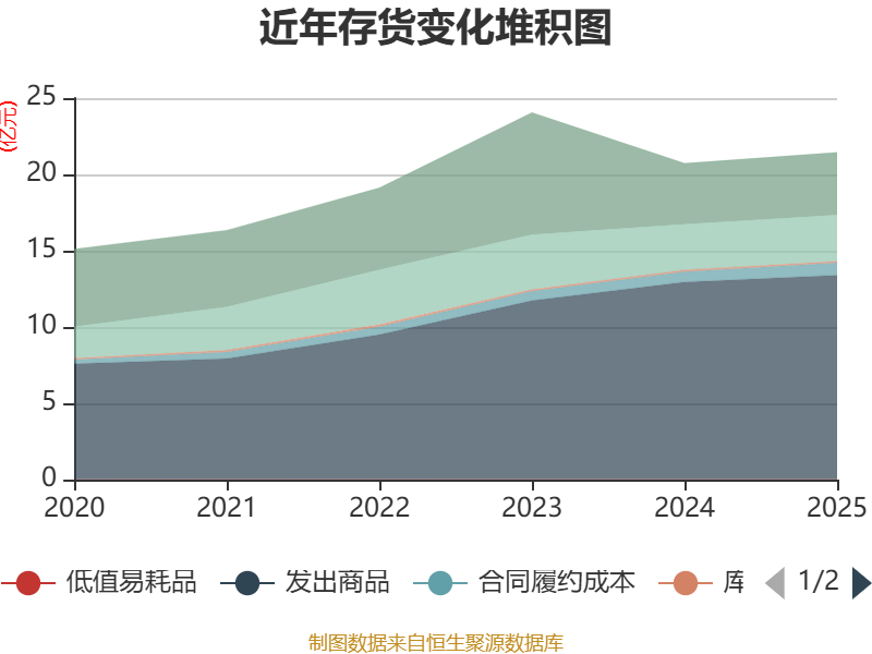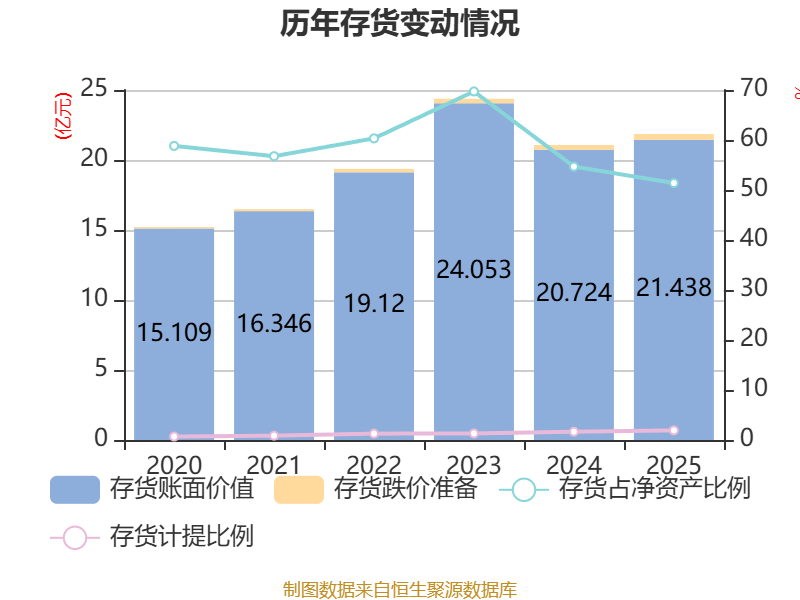 从存货变动来看,截至2025年末,公司存货账面价值为21.44亿元,占净资产的51.39%,较上年末增加7135.31万元。其中,存货跌价准备为4192.94万元,计提比例为1.92%。