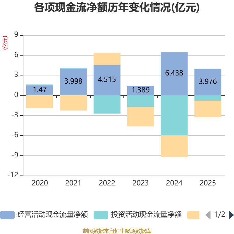 截至2025年,公司经营活动现金流净额为3.98亿元,同比下降38.24%;筹资活动现金流净额-2.47亿元,同比增加7542.49万元;投资活动现金流净额-8048.23万元,上年同期为-6亿元。