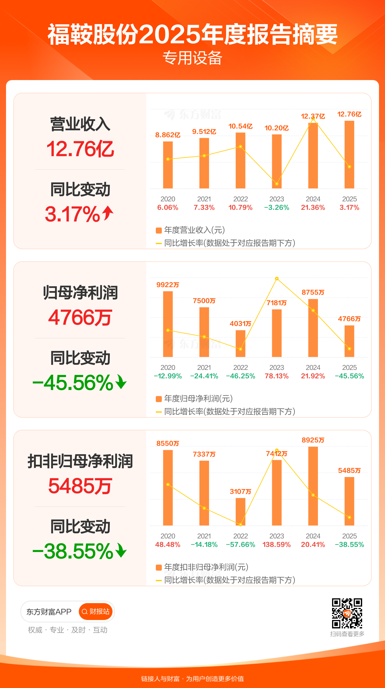 福鞍股份4月28日发布2025年年报显示,公司全年实现营业收入12.76亿元,同比增长3.17%;归母净利润4765.56万元,同比下滑45.56%;扣非归母净利润5484.69万元,同比下滑38.55%。