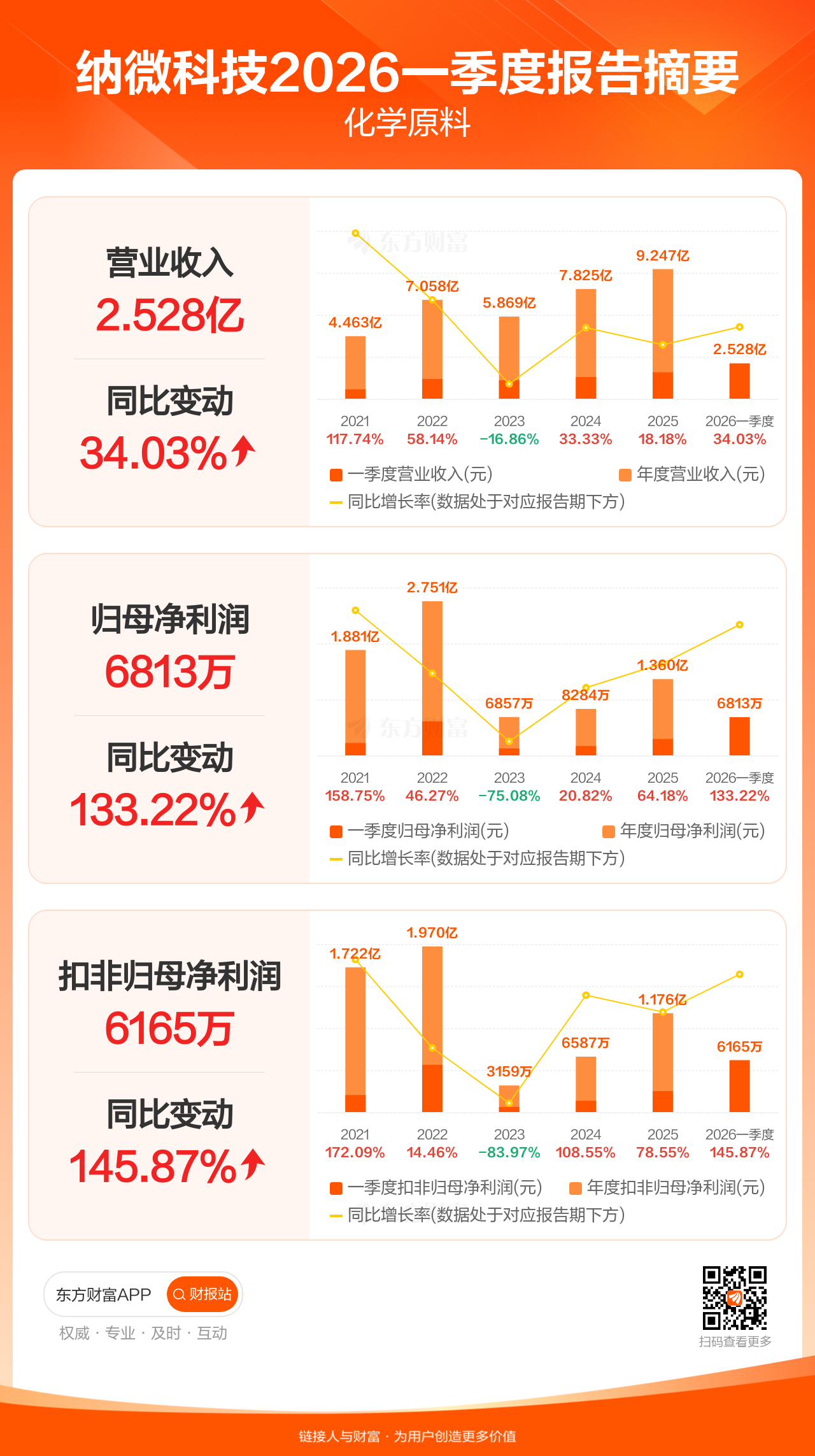 纳微科技4月28日发布2026年一季报显示,公司一季度实现营业收入2.53亿元,同比增长34.03%;归母净利润6813.47万元,同比增长133.22%;扣非归母净利润6165.37万元,同比增长145.87%。