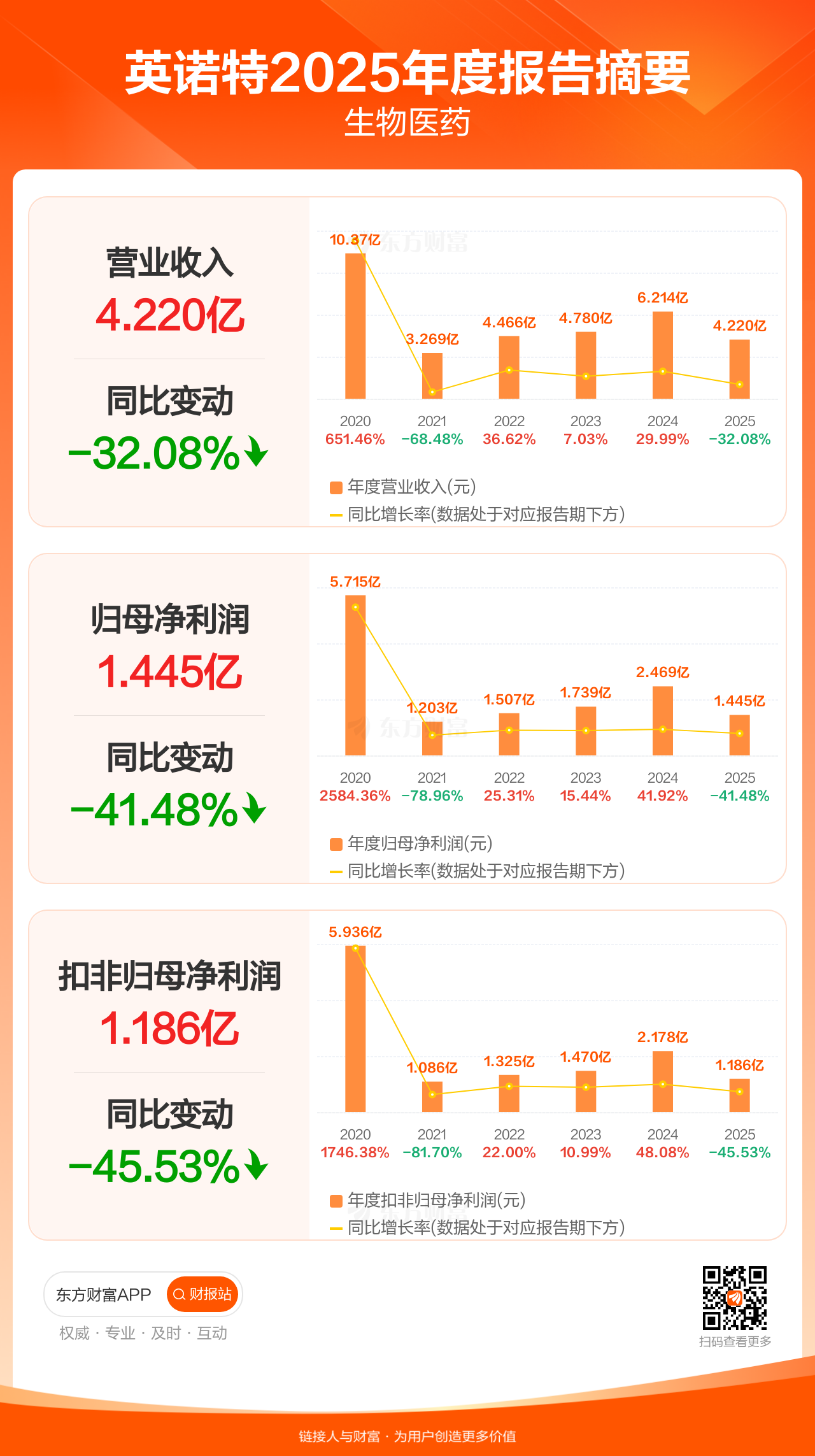 英诺特4月28日发布2025年年报显示,公司全年实现营业收入4.22亿元,同比下滑32.08%;归母净利润1.44亿元,同比下滑41.48%;扣非归母净利润1.19亿元,同比下滑45.53%。